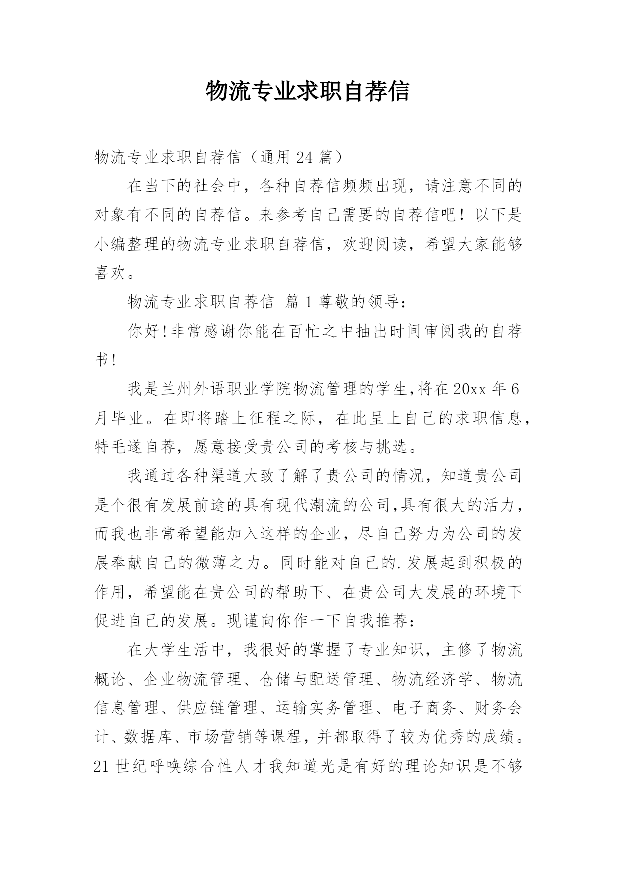 物流专业求职自荐信物流专业求职自荐信(通用24篇)在当下的社会中,各种自荐信频频出现,请注意不同的对象有不同的自荐信。来参考自己需要的自荐信吧!以下是小编整理的物流专业求职自荐信,欢迎阅读,希望大家能够喜欢。物流专业求职自荐信篇1尊敬的领导:你好!非常感谢你能在百忙之中抽出时间审阅我的自荐书!我是兰州外语职业学院物流管理的学生,将在20xx年6月毕业。在即将踏上征程之际,在此呈上自己的求职信息,特毛遂自荐,愿意接受贵公司的考核与挑选。我通过各种渠道大致了解了贵公司的情况,知道贵公司是个很有发展前途的具有现