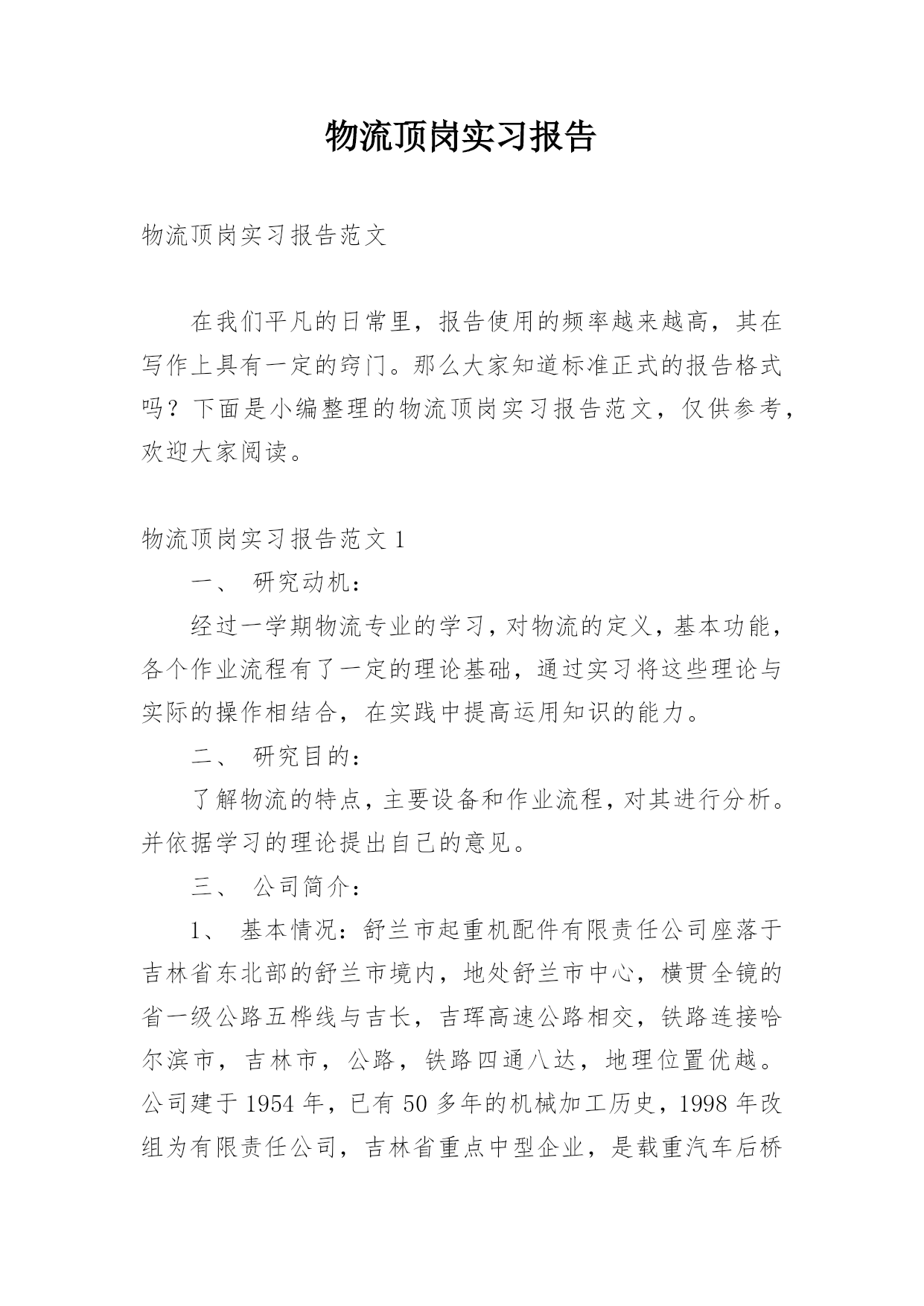 物流顶岗实习报告物流顶岗实习报告范文在我们平凡的日常里,报告使用的频率越来越高,其在写作上具有一定的窍门。那么大家知道标准正式的报告格式吗?下面是小编整理的物流顶岗实习报告范文,仅供参考,欢迎大家阅读。物流顶岗实习报告范文1一、研究动机:经过一学期物流专业的学习,对物流的定义,基本功能,各个作业流程有了一定的理论基础,通过实习将这些理论与实际的操作相结合,在实践中提高运用知识的能力。二、研究目的:了解物流的特点,主要设备和作业流程,对其进行分析。并依据学习的理论提出自己的意见。三、公司简介:1、基本情况: