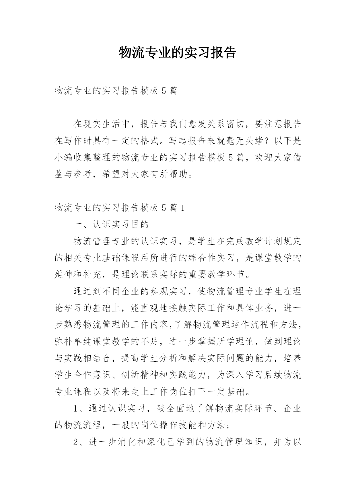 物流专业的实习报告物流专业的实习报告模板5篇在现实生活中,报告与我们愈发关系密切,要注意报告在写作时具有一定的格式。写起报告来就毫无头绪?以下是小编收集整理的物流专业的实习报告模板5篇,欢迎大家借鉴与参考,希望对大家有所帮助。物流专业的实习报告模板5篇1一、认识实习目的物流管理专业的认识实习,是学生在完成教学计划规定的相关专业基础课程后所进行的综合性实习,是课堂教学的延伸和补充,是理论联系实际的重要教学环节。通过到不同企业的参观实习,使物流管理专业学生在理论学习的基础上,能直观地接触实际工作和具体业务,进
