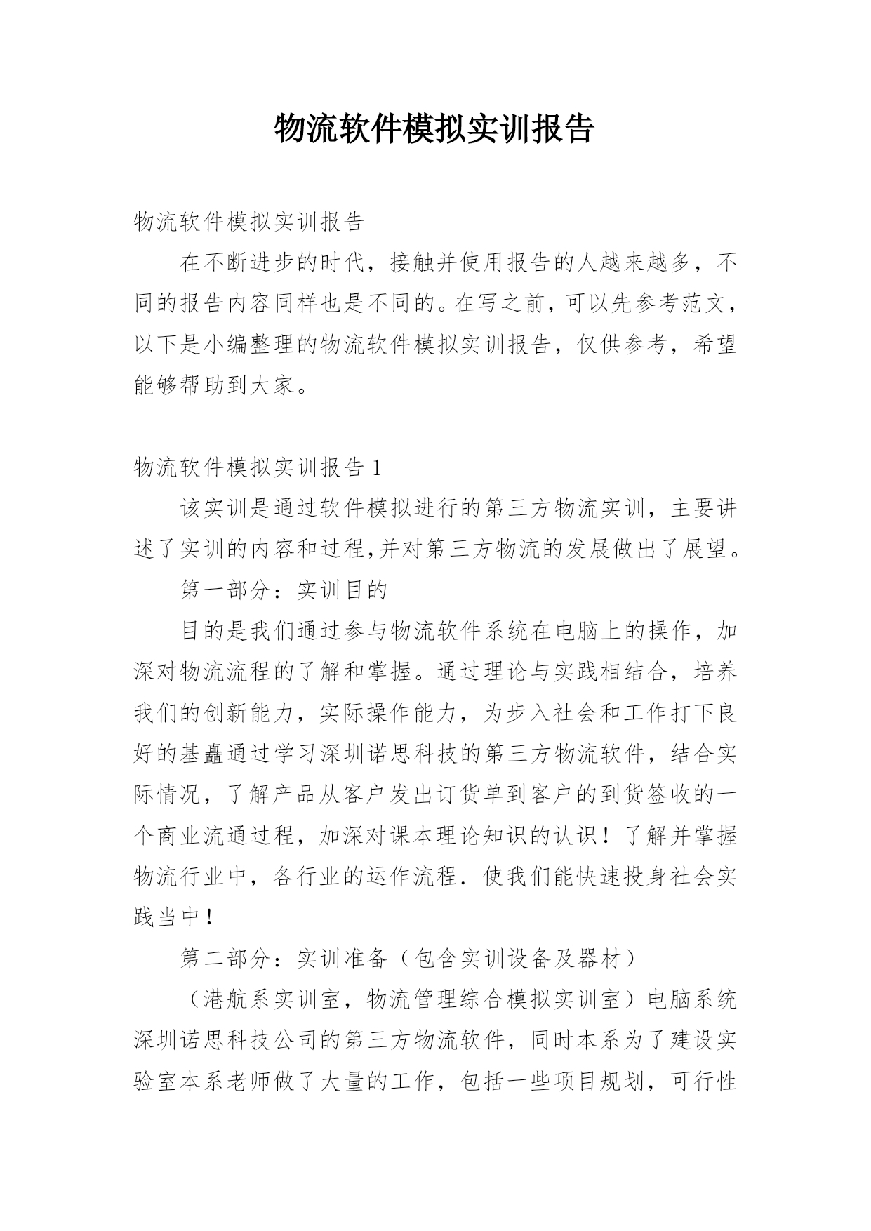 物流软件模拟实训报告物流软件模拟实训报告在不断进步的时代,接触并使用报告的人越来越多,不同的报告内容同样也是不同的。在写之前,可以先参考范文,以下是小编整理的物流软件模拟实训报告,仅供参考,希望能够帮助到大家。物流软件模拟实训报告1该实训是通过软件模拟进行的第三方物流实训,主要讲述了实训的内容和过程,并对第三方物流的发展做出了展望。第一部分:实训目的目的是我们通过参与物流软件系统在电脑上的操作,加深对物流流程的了解和掌握。通过理论与实践相结合,培养我们的创新能力,实际操作能力,为步入社会和工作打下良好的基