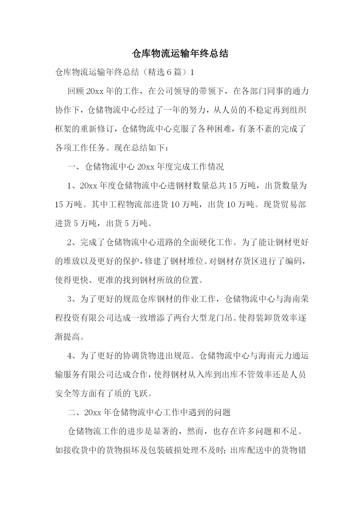 仓库物流运输年终总结仓库物流运输年终总结(精选6篇)1回顾20xx年的工作,在公司领导的带领下,在各部门同事的通力协作下,仓储物流中心经过了一年的努力,从人员的不稳定再到组织框架的重新修订,仓储物流中心克服了各种困难,有条不紊的完成了各项工作任务。现在总结如下:一、仓储物流中心20xx年度完成工作情况1、20xx年度仓储物流中心进钢材数量总共15万吨,出货数量为15万吨。其中工程物流部进货10万吨,出货10万吨。现货贸易部进货5万吨,出货5万吨。2、完成了仓储物流中心道路的全面硬化工作。为了能让钢材更好的