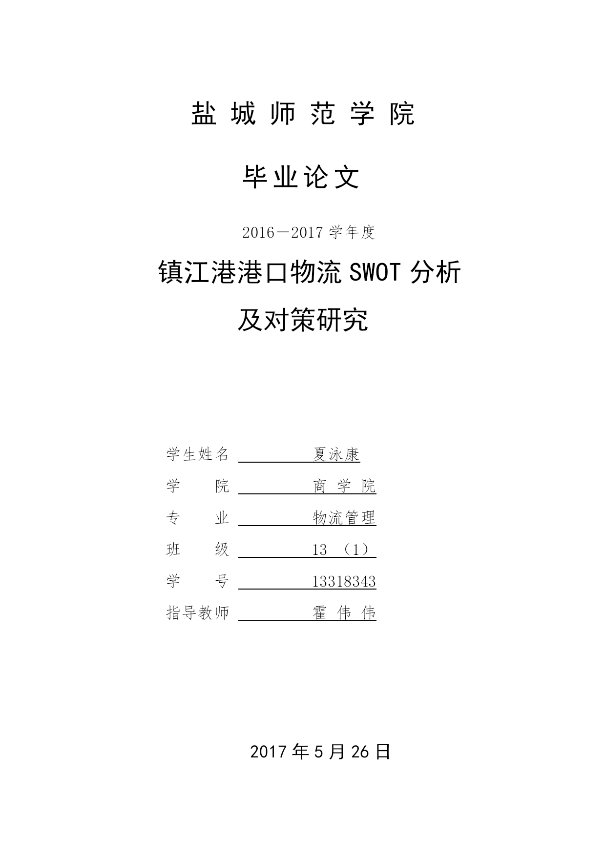 盐城师范学院毕业论文盐城师范学院毕业论文2016-2017学年度镇江港港口物流SWOT分析及对策研究学生姓名夏泳康学院商学院专业物流管理班级13(1)学号13318343指导教师霍伟伟2017年5月26日镇江港港口物流SWOT分析及对策研究摘要随着“十八大”以来,中央部署的长江经济带、“一带一路”等战略的大力推进以及互联网技术的迅速发展,沿江沿海港口的战略定定位就变得尤为重要。本文立足于镇江港,运用了SWOT分析法开展定性研究。研究首先对镇江港发展现状、自身优势、劣势进行了分析。研究发现镇江港在地理位置、