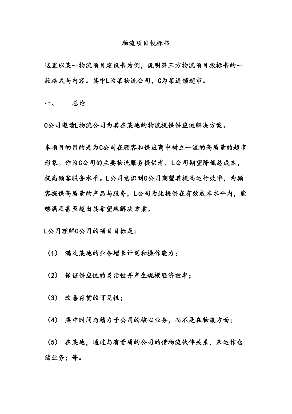 物流项目投标书这里以某一物流项目建议书为例,说明第三方物流项目投标书的一般格式与内容。其中L为某物流公司,C为某连锁超市。一、总论C公司邀请L物流公司为其在某地的物流提供供应链解决方案。本项目的目的是为C公司在顾客和供应商中树立一流的高质量的超市形象。作为C公司的主要物流服务提供者,L公司期望降低总成本,提高顾客服务水平。L公司意识到C公司期望其提高运行效率,为顾客提供高质量的产品与服务,L公司为此提供在有效成本水平内,能够满足甚至超出其希望地解决方案。L公司理解C公司的项目目标是:(1)满足某地的业务增