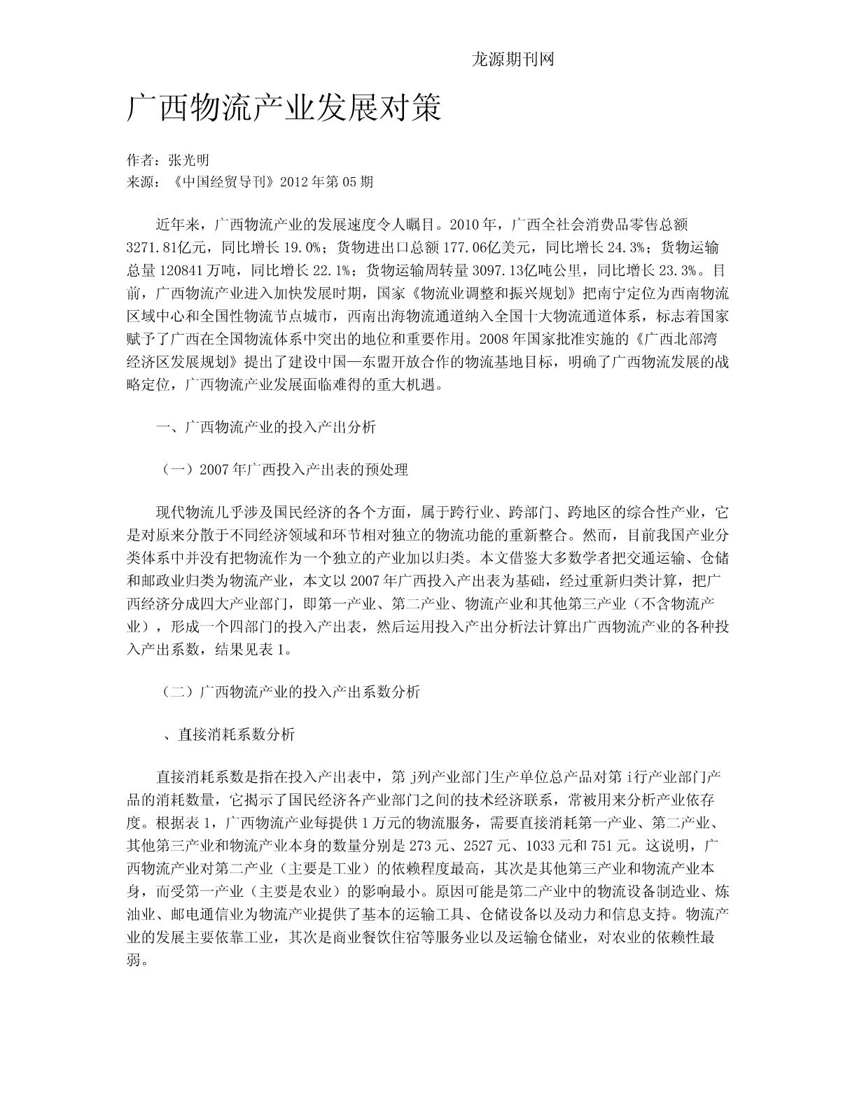 龙源期刊网广西物流产业发展对策作者:张光明来源:《中国经贸导刊》2012年第05期近年来,广西物流产业的发展速度令人瞩目。2010年,广西全社会消费品零售总额3271.81亿元,同比增长19.0%;货物进出口总额177.06亿美元,同比增长24.3%;货物运输总量120841万吨,同比增长22.1%;货物运输周转量3097.13亿吨公里,同比增长23.3%。目前,广西物流产业进入加快发展时期,国家《物流业调整和振兴规划》把南宁定位为西南物流区域中心和全国性物流节点城市,西南出海物流通道纳入全国十大物流通道