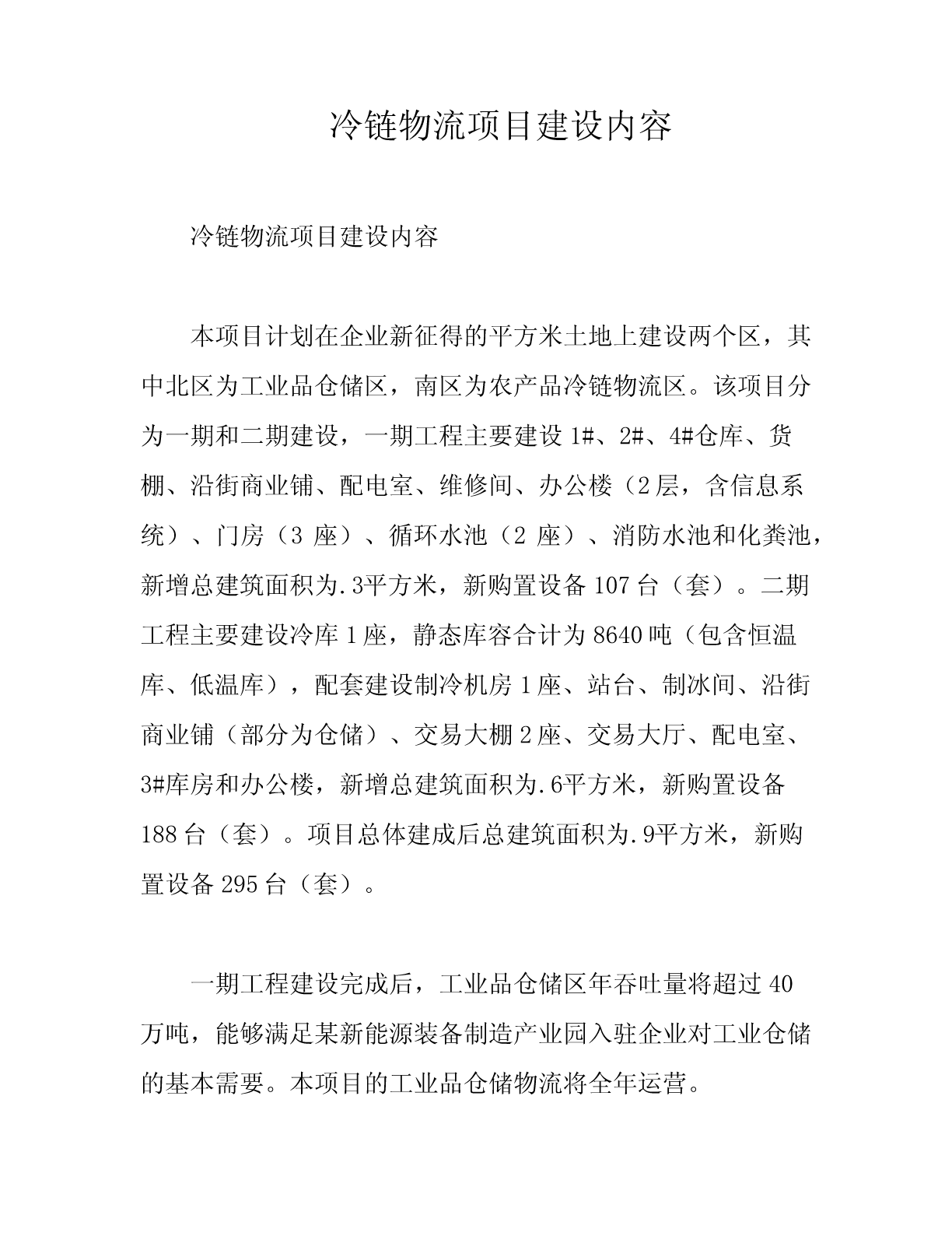 冷链物流项目建设内容冷链物流项目建设内容本项目计划在企业新征得的平方米土地上建设两个区,其中北区为工业品仓储区,南区为农产品冷链物流区。该项目分为一期和二期建设,一期工程主要建设1#、2#、4#仓库、货棚、沿街商业铺、配电室、维修间、办公楼(2层,含信息系统)、门房(3座)、循环水池(2座)、消防水池和化粪池,新增总建筑面积为.3平方米,新购置设备107台(套)。二期工程主要建设冷库1座,静态库容合计为8640吨(包含恒温库、低温库),配套建设制冷机房1座、站台、制冰间、沿街商业铺(部分为仓储)、交易大棚