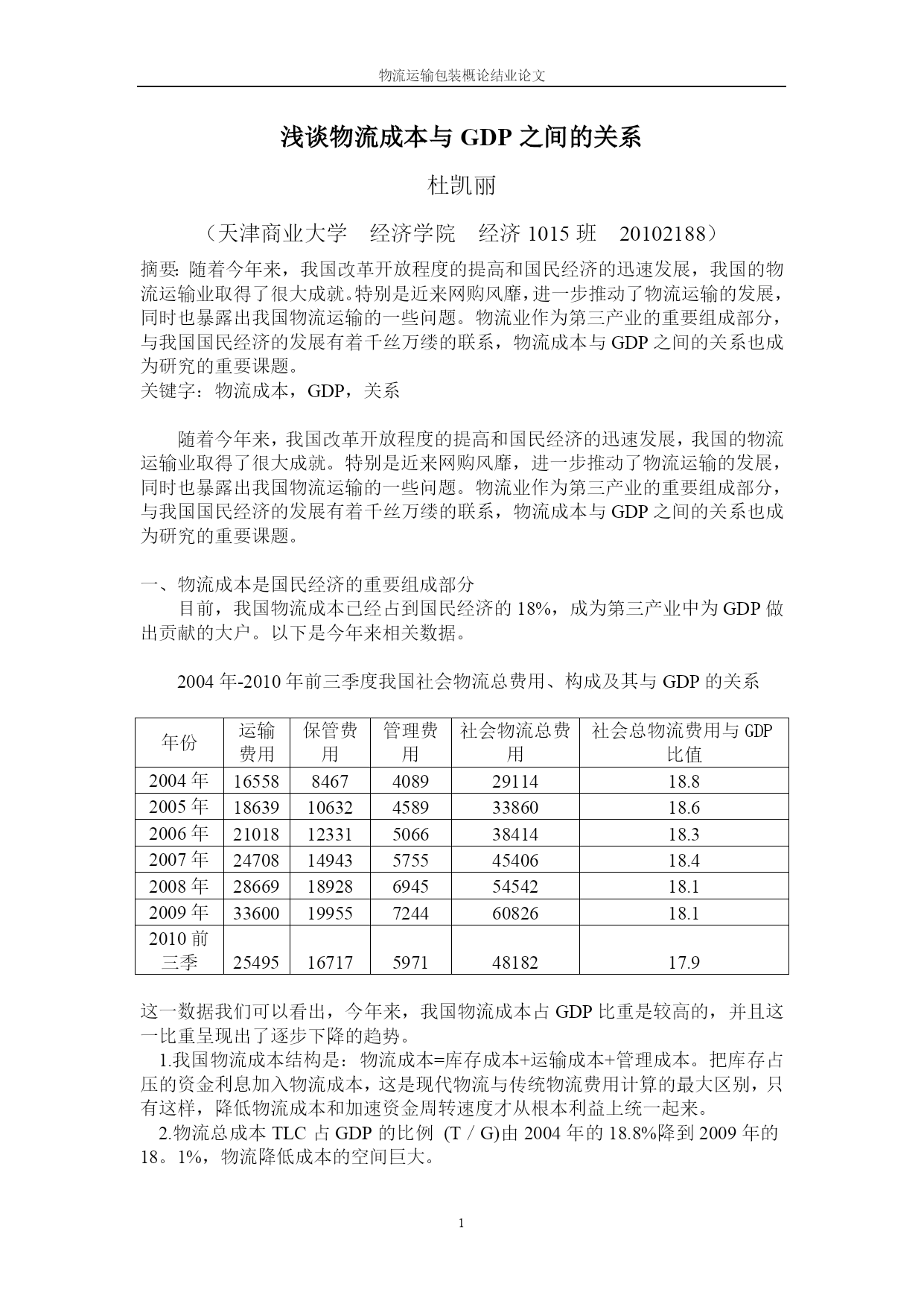 物流运输包装概论结业论文PAGE5浅谈物流成本与GDP之间的关系杜凯丽(天津商业大学经济学院经济1015班20102188)摘要:随着今年来,我国改革开放程度的提高和国民经济的迅速发展,我国的物流运输业取得了很大成就。特别是近来网购风靡,进一步推动了物流运输的发展,同时也暴露出我国物流运输的一些问题。物流业作为第三产业的重要组成部分,与我国国民经济的发展有着千丝万缕的联系,物流成本与GDP之间的关系也成为研究的重要课题。关键字:物流成本,GDP,关系随着今年来,我国改革开放程度的提高和国民经济的迅速
