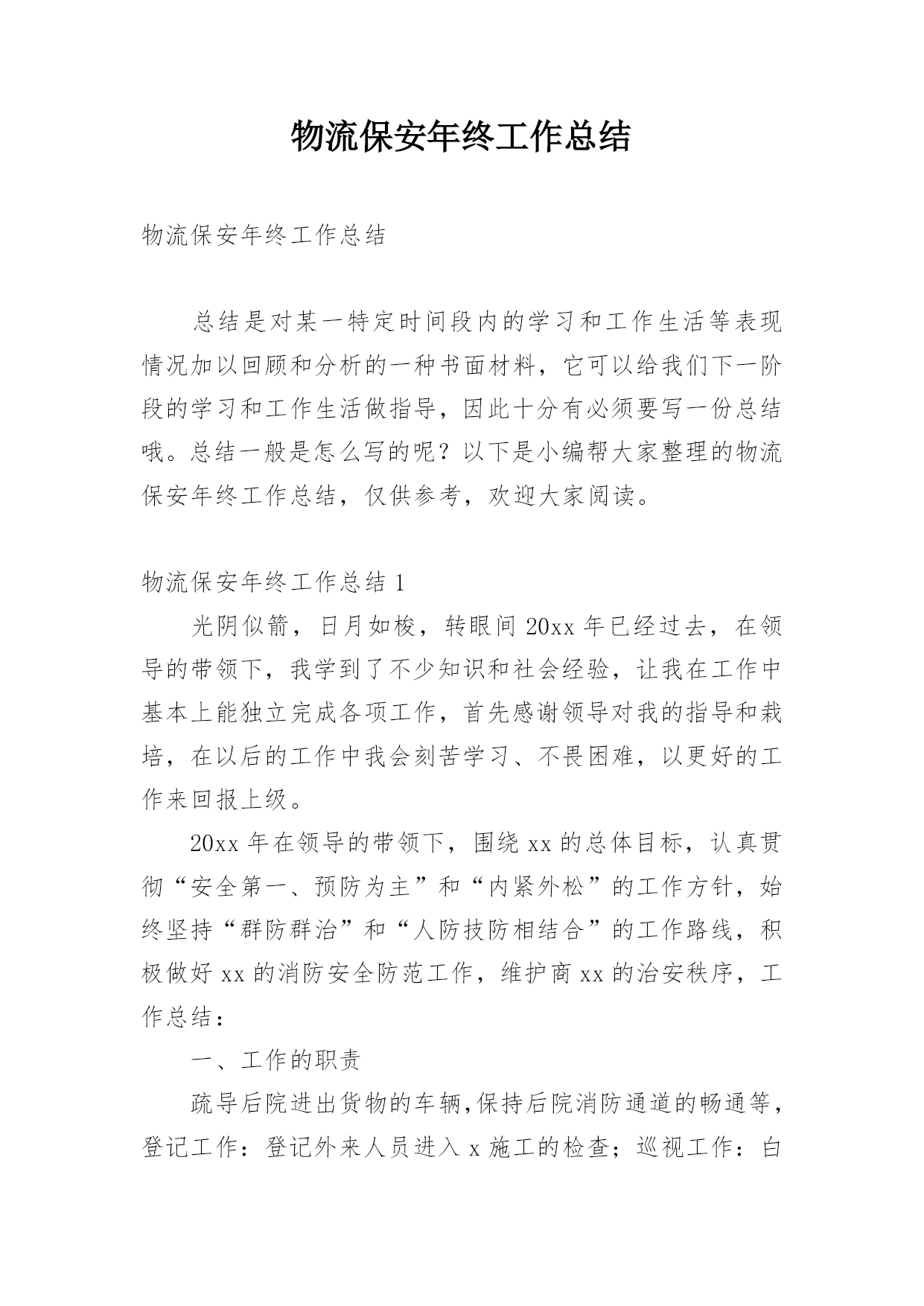 物流保安年终工作总结物流保安年终工作总结总结是对某一特定时间段内的学习和工作生活等表现情况加以回顾和分析的一种书面材料,它可以给我们下一阶段的学习和工作生活做指导,因此十分有必须要写一份总结哦。总结一般是怎么写的呢?以下是小编帮大家整理的物流保安年终工作总结,仅供参考,欢迎大家阅读。物流保安年终工作总结1光阴似箭,日月如梭,转眼间20xx年已经过去,在领导的带领下,我学到了不少知识和社会经验,让我在工作中基本上能独立完成各项工作,首先感谢领导对我的指导和栽培,在以后的工作中我会刻苦学习、不畏困难,以更好的