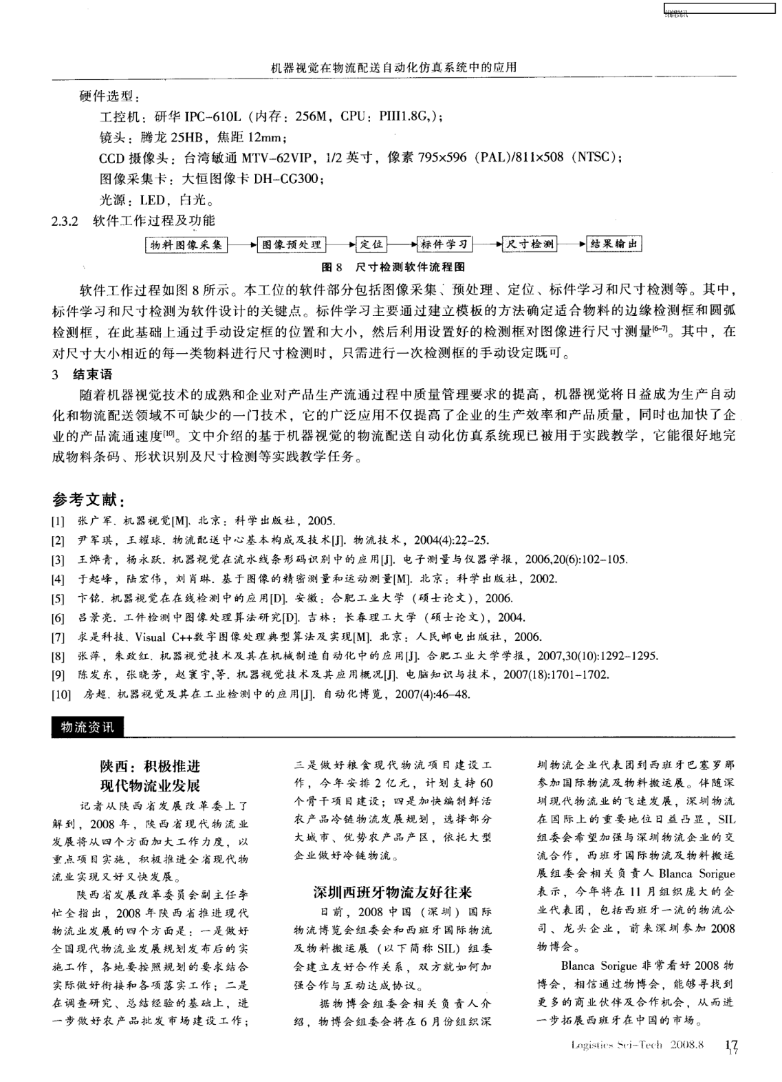 机器视觉在物流配送自动化仿真系统中的应用硬件选型:工控机:研华IPC一610L(内存:256M,CPU:PIII1.8G,);镜头:腾龙25HB,焦距12mm;CCD摄像头:台湾敏通MTV一62VIP,1/2英寸,像素795x596(PAL)/811x508(NTSC);图像采集卡:大恒图像卡DH—CG300;光源:LED,白光。2_3.2软件工作过程及功能I物料图像采集—I图像预处理卜_I—定位卜__—叫标件学习卜_I__叫尺寸检测—l结果输出I图8尺寸检测软件流程图软件工作过程如图8所示。本工位的软件