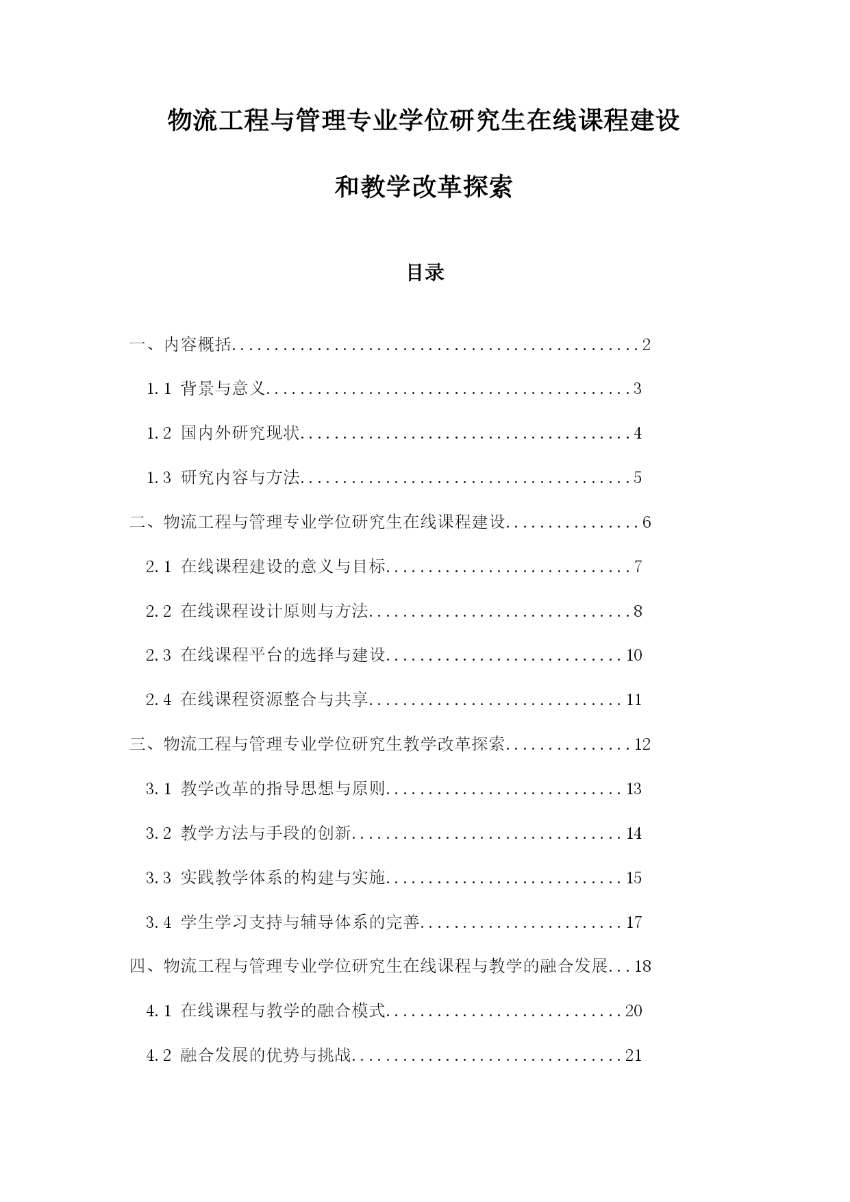 物流工程与管理专业学位研究生在线课程建设和教学改革探索目录一、内容概括................................................21.1背景与意义...........................................31.2国内外研究现状.......................................41.3研究内容与方法.......................................5二、物流工程与管理专业学位研究生在线课