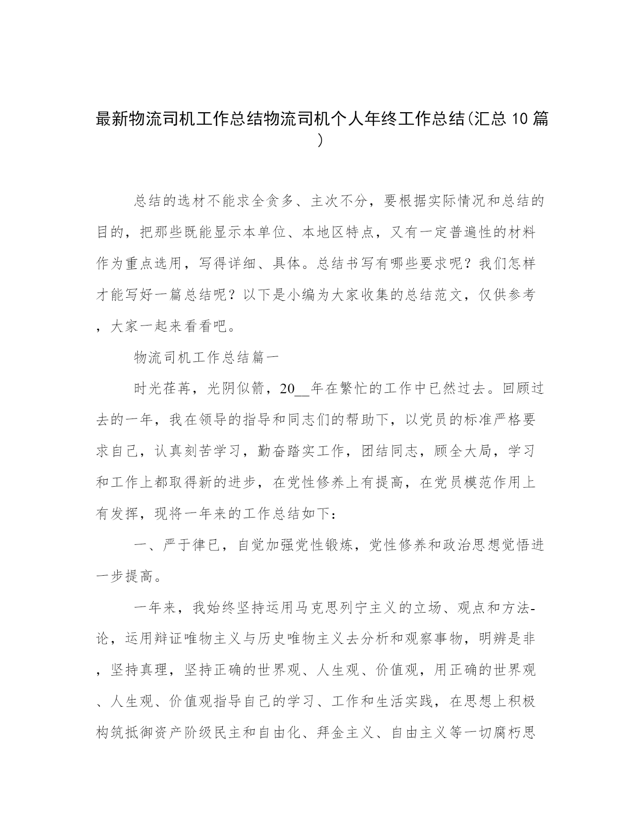 最新物流司机工作总结物流司机个人年终工作总结(汇总10篇).docx