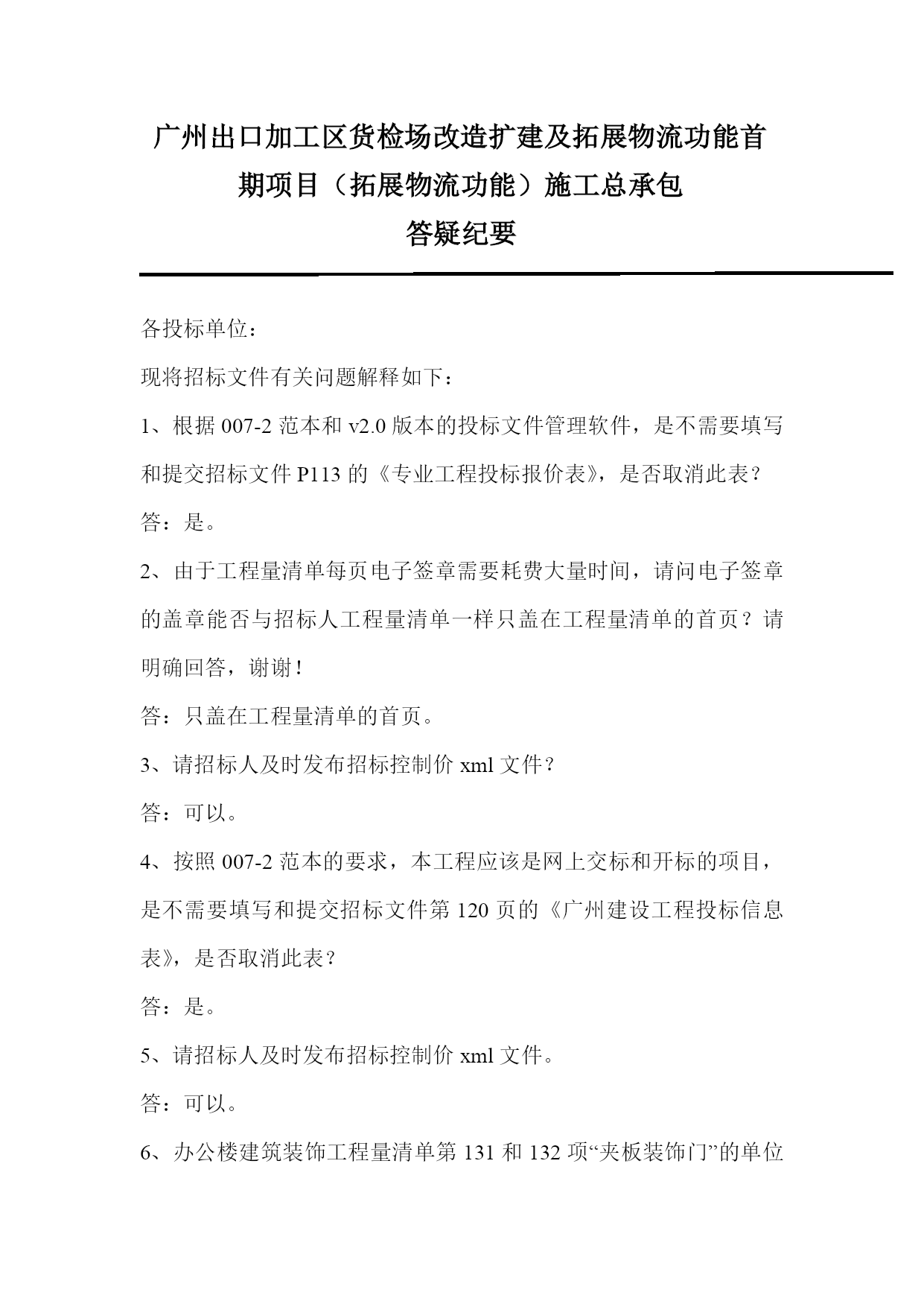 广州出口加工区货检场改造扩建及拓展物流功能首期项目(拓展物流功能)施工总承包答疑纪要各投标单位:现将招标文件有关问题解释如下:1、根据007-2范本和v2.0版本的投标文件管理软件,是不需要填写和提交招标文件P113的《专业工程投标报价表》,是否取消此表?答:是。2、由于工程量清单每页电子签章需要耗费大量时间,请问电子签章的盖章能否与招标人工程量清单一样只盖在工程量清单的首页?请明确回答,谢谢!答:只盖在工程量清单的首页。3、请招标人及时发布招标控制价xml文件?答:可以。4、按照007-2范本的要求,本