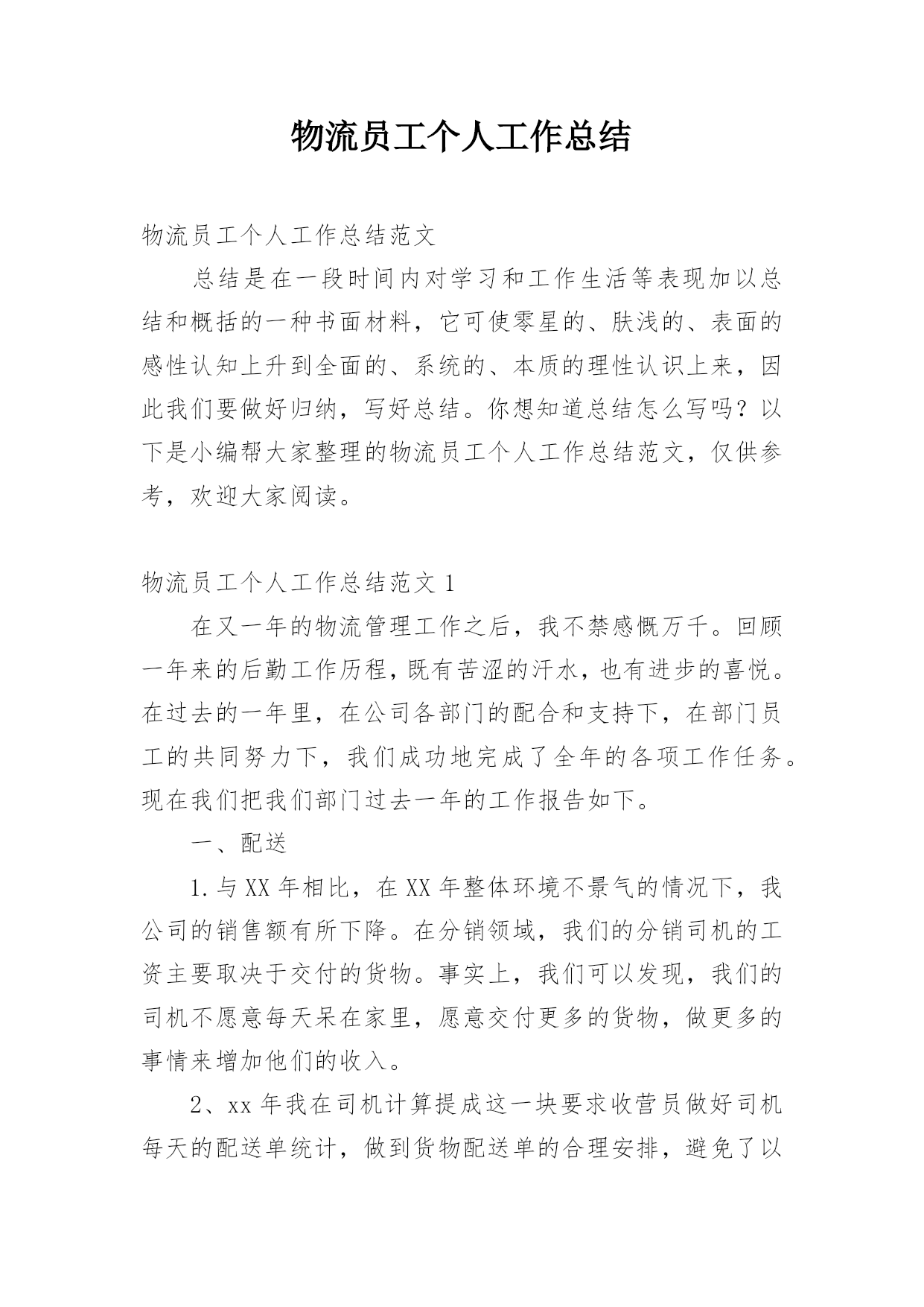 物流员工个人工作总结物流员工个人工作总结范文总结是在一段时间内对学习和工作生活等表现加以总结和概括的一种书面材料,它可使零星的、肤浅的、表面的感性认知上升到全面的、系统的、本质的理性认识上来,因此我们要做好归纳,写好总结。你想知道总结怎么写吗?以下是小编帮大家整理的物流员工个人工作总结范文,仅供参考,欢迎大家阅读。物流员工个人工作总结范文1在又一年的物流管理工作之后,我不禁感慨万千。回顾一年来的后勤工作历程,既有苦涩的汗水,也有进步的喜悦。在过去的一年里,在公司各部门的配合和支持下,在部门员工的共同努力下