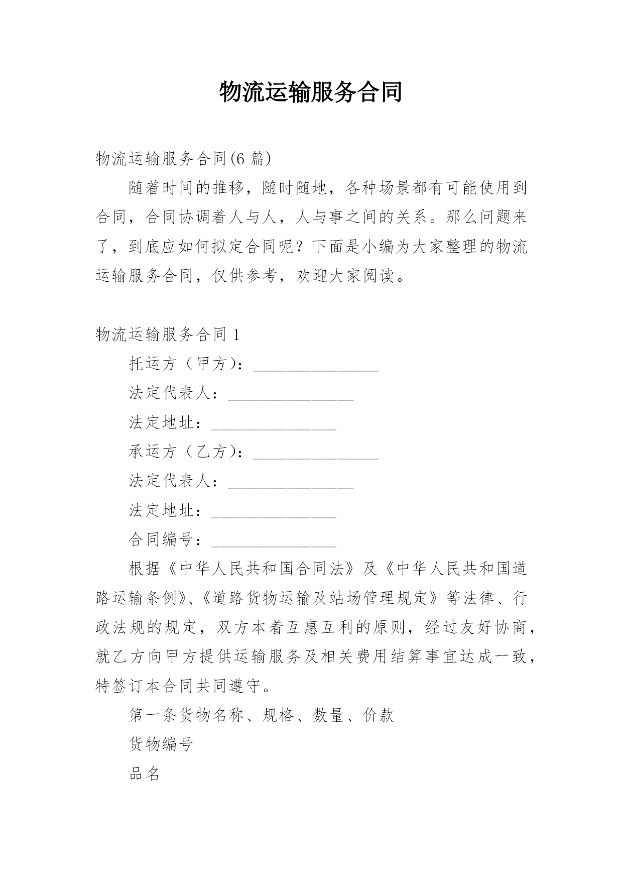 物流运输服务合同物流运输服务合同(6篇)随着时间的推移,随时随地,各种场景都有可能使用到合同,合同协调着人与人,人与事之间的关系。那么问题来了,到底应如何拟定合同呢?下面是小编为大家整理的物流运输服务合同,仅供参考,欢迎大家阅读。物流运输服务合同1托运方(甲方):_______________法定代表人:_______________法定地址:_______________承运方(乙方):_______________法定代表人:_______________法定地址:_______________合同编