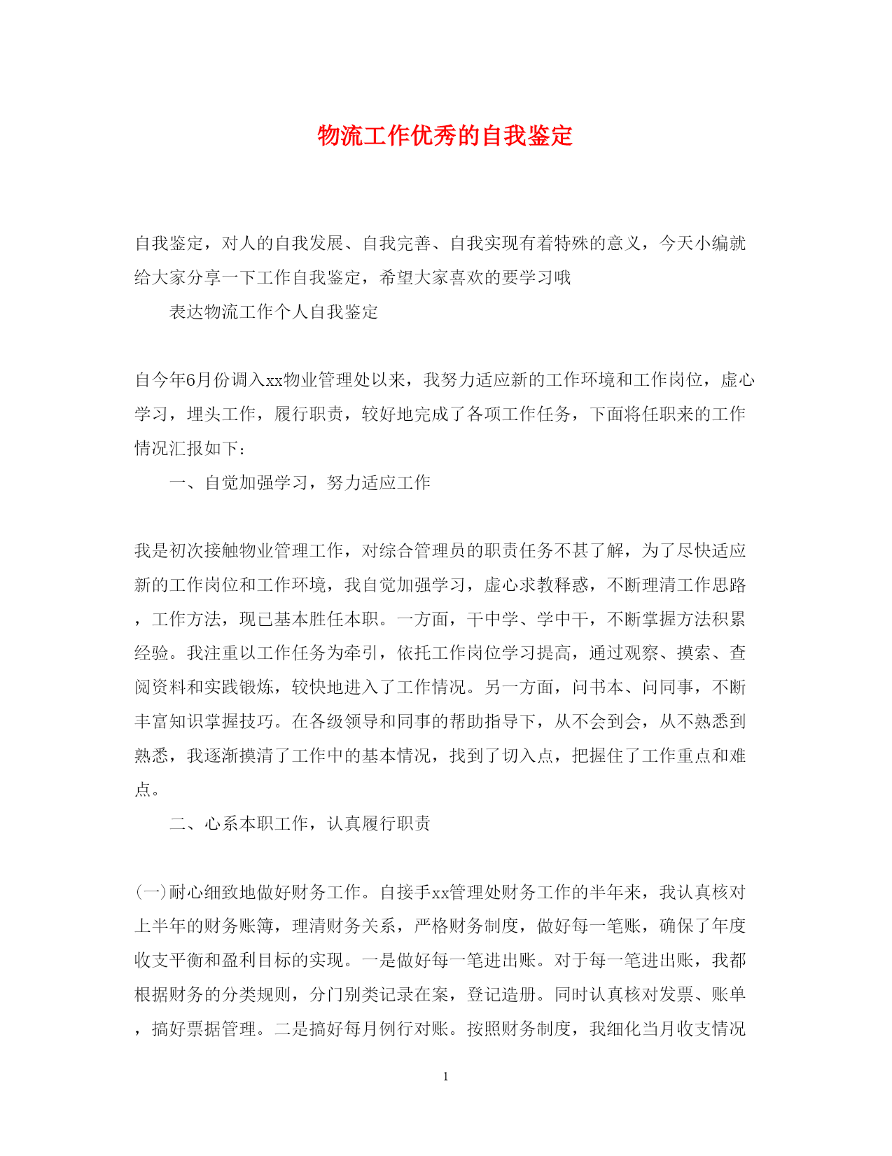 此资料由网络收集而来,如有侵权请告知上传者立即删除。资料共分享,我们负责传递知识。PAGEPAGE4物流工作优秀的自我鉴定自我鉴定,对人的自我发展、自我完善、自我实现有着特殊的意义,今天小编就给大家分享一下工作自我鉴定,希望大家喜欢的要学习哦表达物流工作个人自我鉴定自今年6月份调入xx物业管理处以来,我努力适应新的工作环境和工作岗位,虚心学习,埋头工作,履行职责,较好地完成了各项工作任务,下面将任职来的工作情况汇报如下:一、自觉加强学习,努力适应工作我是初次接触物业管理工作,对综合管理员的职责