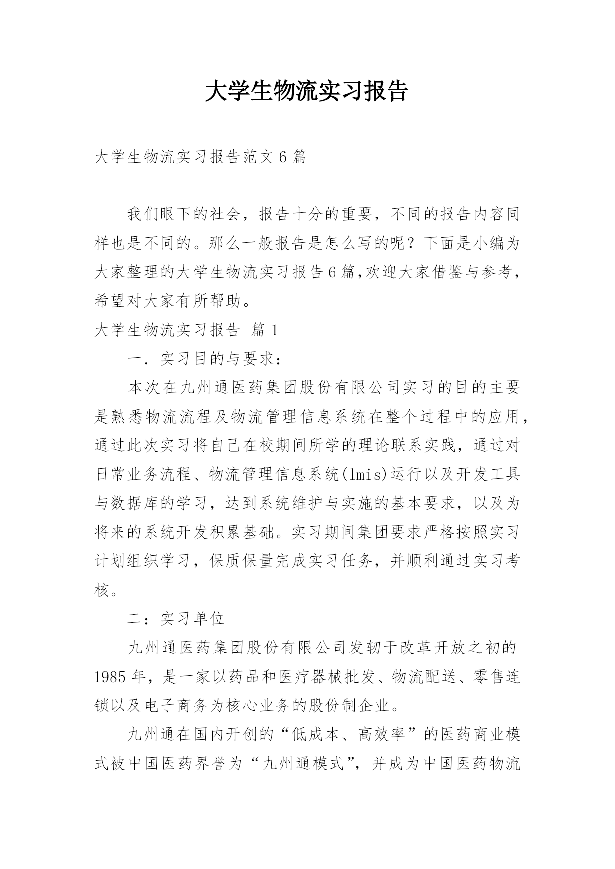 大学生物流实习报告大学生物流实习报告范文6篇我们眼下的社会,报告十分的重要,不同的报告内容同样也是不同的。那么一般报告是怎么写的呢?下面是小编为大家整理的大学生物流实习报告6篇,欢迎大家借鉴与参考,希望对大家有所帮助。大学生物流实习报告篇1一.实习目的与要求:本次在九州通医药集团股份有限公司实习的目的主要是熟悉物流流程及物流管理信息系统在整个过程中的应用,通过此次实习将自己在校期间所学的理论联系实践,通过对日常业务流程、物流管理信息系统(lmis)运行以及开发工具与数据库的学习,达到系统维护与实施的基本要