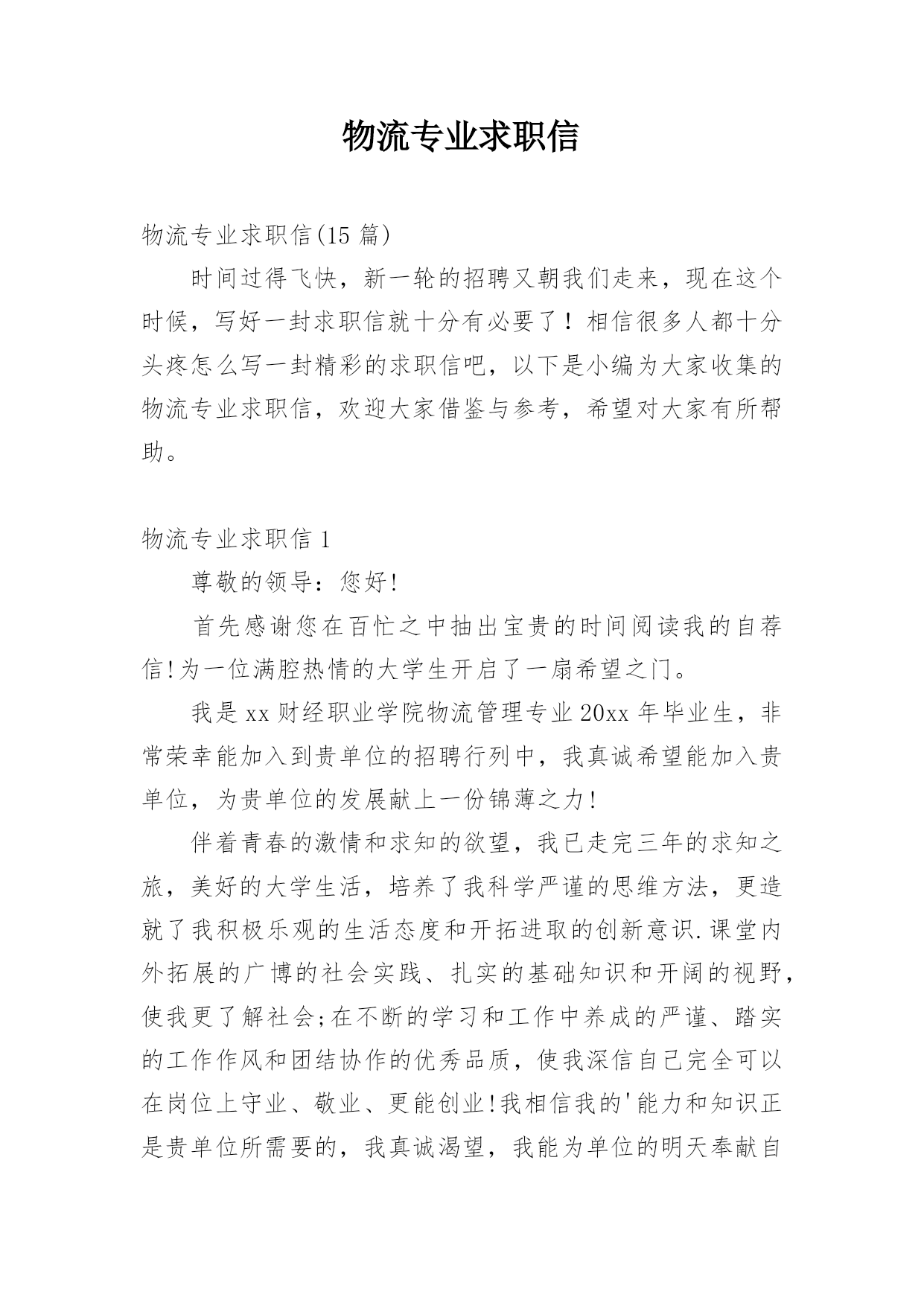 物流专业求职信物流专业求职信(15篇)时间过得飞快,新一轮的招聘又朝我们走来,现在这个时候,写好一封求职信就十分有必要了!相信很多人都十分头疼怎么写一封精彩的求职信吧,以下是小编为大家收集的物流专业求职信,欢迎大家借鉴与参考,希望对大家有所帮助。物流专业求职信1尊敬的领导:您好!首先感谢您在百忙之中抽出宝贵的时间阅读我的自荐信!为一位满腔热情的大学生开启了一扇希望之门。我是xx财经职业学院物流管理专业20xx年毕业生,非常荣幸能加入到贵单位的招聘行列中,我真诚希望能加入贵单位,为贵单位的发展献上一份锦薄之