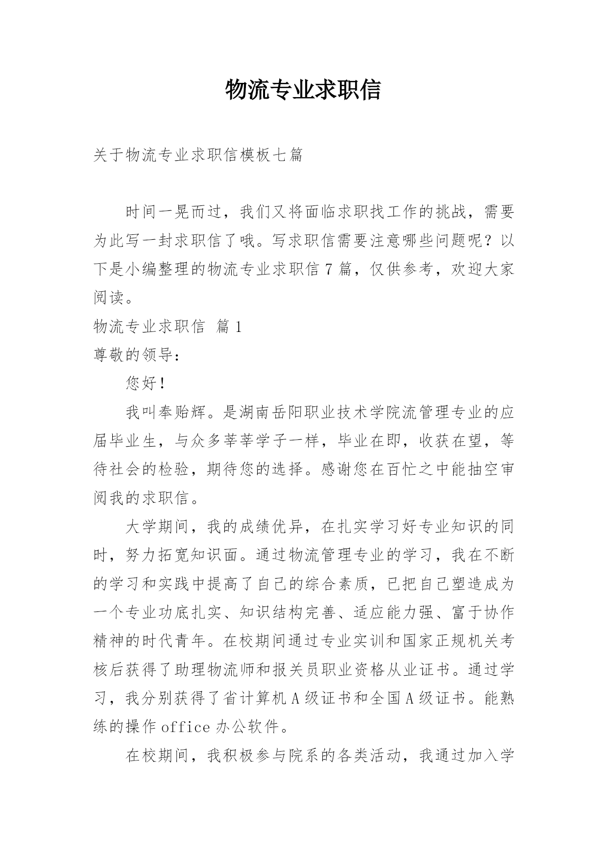 物流专业求职信关于物流专业求职信模板七篇时间一晃而过,我们又将面临求职找工作的挑战,需要为此写一封求职信了哦。写求职信需要注意哪些问题呢?以下是小编整理的物流专业求职信7篇,仅供参考,欢迎大家阅读。物流专业求职信篇1尊敬的领导:您好!我叫奉贻辉。是湖南岳阳职业技术学院流管理专业的应届毕业生,与众多莘莘学子一样,毕业在即,收获在望,等待社会的检验,期待您的选择。感谢您在百忙之中能抽空审阅我的求职信。大学期间,我的成绩优异,在扎实学习好专业知识的同时,努力拓宽知识面。通过物流管理专业的学习,我在不断的学习和实