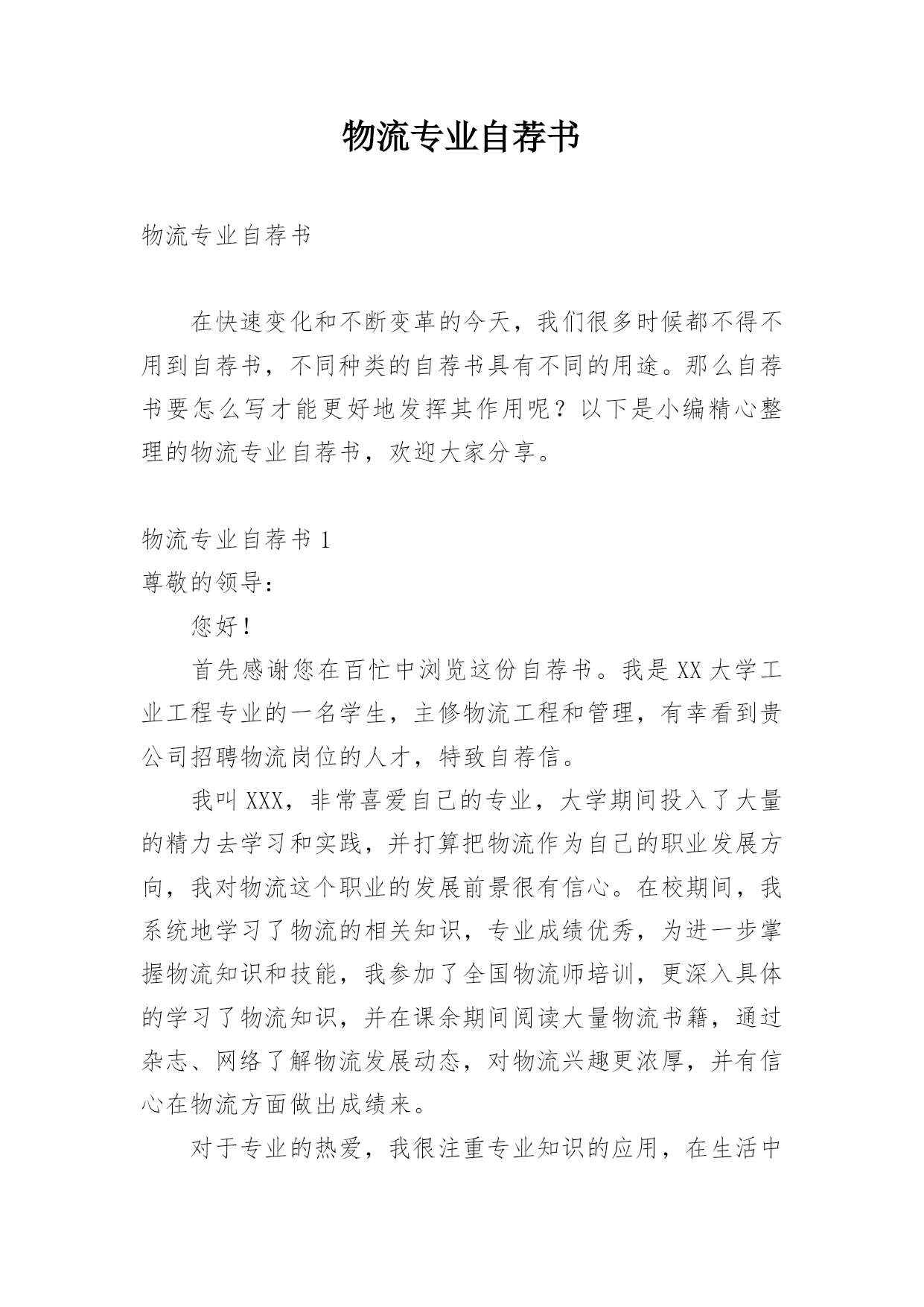 物流专业自荐书物流专业自荐书在快速变化和不断变革的今天,我们很多时候都不得不用到自荐书,不同种类的自荐书具有不同的用途。那么自荐书要怎么写才能更好地发挥其作用呢?以下是小编精心整理的物流专业自荐书,欢迎大家分享。物流专业自荐书1尊敬的领导:您好!首先感谢您在百忙中浏览这份自荐书。我是XX大学工业工程专业的一名学生,主修物流工程和管理,有幸看到贵公司招聘物流岗位的人才,特致自荐信。我叫XXX,非常喜爱自己的专业,大学期间投入了大量的精力去学习和实践,并打算把物流作为自己的职业发展方向,我对物流这个职业的发展