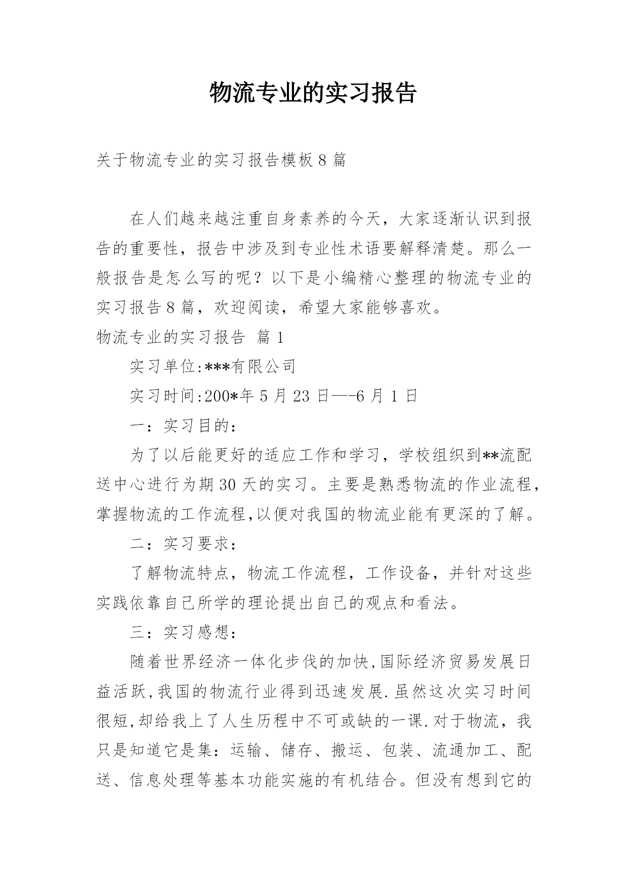 物流专业的实习报告关于物流专业的实习报告模板8篇在人们越来越注重自身素养的今天,大家逐渐认识到报告的重要性,报告中涉及到专业性术语要解释清楚。那么一般报告是怎么写的呢?以下是小编精心整理的物流专业的实习报告8篇,欢迎阅读,希望大家能够喜欢。物流专业的实习报告篇1实习单位:***有限公司实习时间:200*年5月23日—-6月1日一:实习目的:为了以后能更好的适应工作和学习,学校组织到**流配送中心进行为期30天的实习。主要是熟悉物流的作业流程,掌握物流的工作流程,以便对我国的物流业能有更深的了解。二:实习要