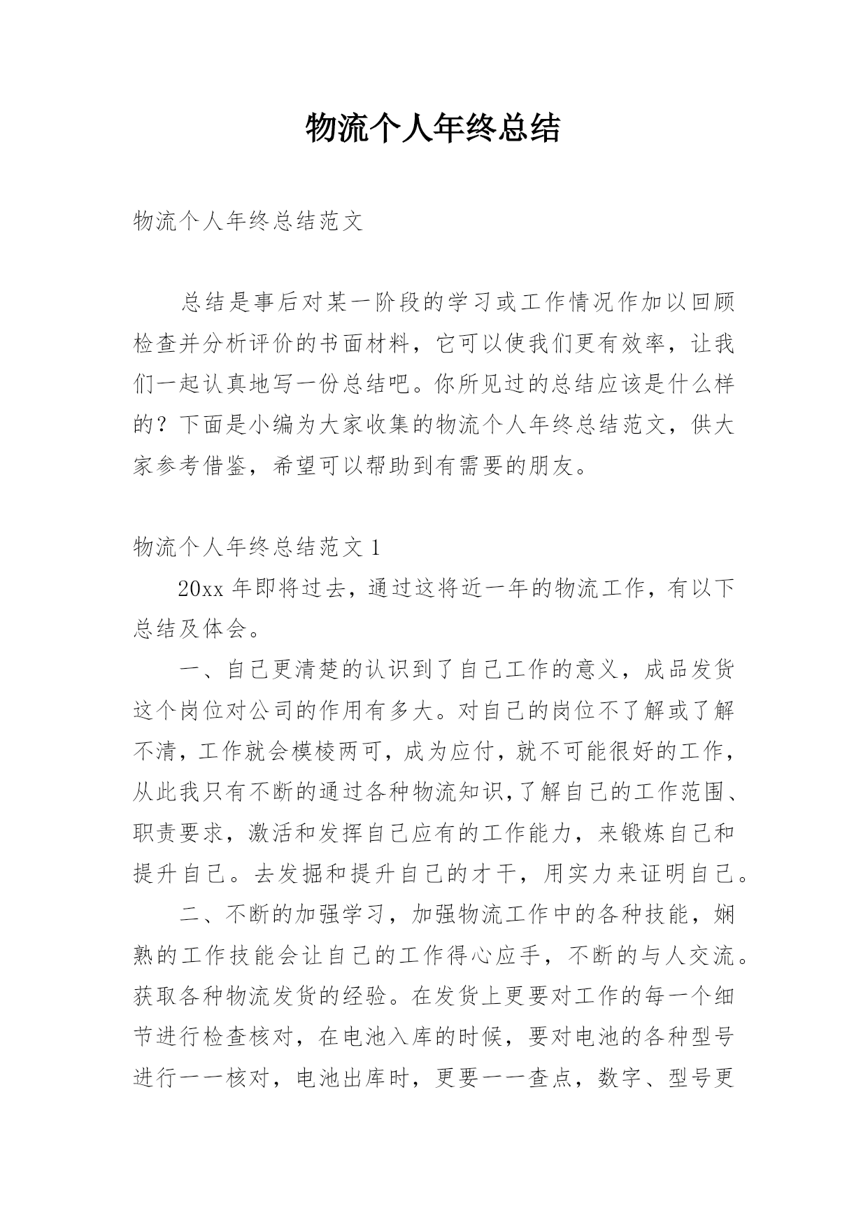 物流个人年终总结物流个人年终总结范文总结是事后对某一阶段的学习或工作情况作加以回顾检查并分析评价的书面材料,它可以使我们更有效率,让我们一起认真地写一份总结吧。你所见过的总结应该是什么样的?下面是小编为大家收集的物流个人年终总结范文,供大家参考借鉴,希望可以帮助到有需要的朋友。物流个人年终总结范文120xx年即将过去,通过这将近一年的物流工作,有以下总结及体会。一、自己更清楚的认识到了自己工作的意义,成品发货这个岗位对公司的作用有多大。对自己的岗位不了解或了解不清,工作就会模棱两可,成为应付,就不可能很好