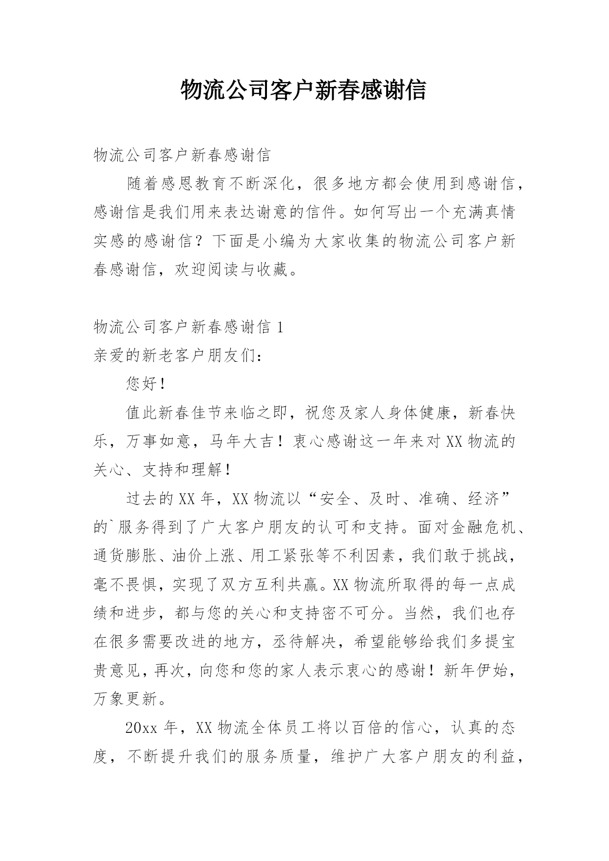 物流公司客户新春感谢信物流公司客户新春感谢信随着感恩教育不断深化,很多地方都会使用到感谢信,感谢信是我们用来表达谢意的信件。如何写出一个充满真情实感的感谢信?下面是小编为大家收集的物流公司客户新春感谢信,欢迎阅读与收藏。物流公司客户新春感谢信1亲爱的新老客户朋友们:您好!值此新春佳节来临之即,祝您及家人身体健康,新春快乐,万事如意,马年大吉!衷心感谢这一年来对XX物流的关心、支持和理解!过去的XX年,XX物流以“安全、及时、准确、经济”的`服务得到了广大客户朋友的认可和支持。面对金融危机、通货膨胀、油价上