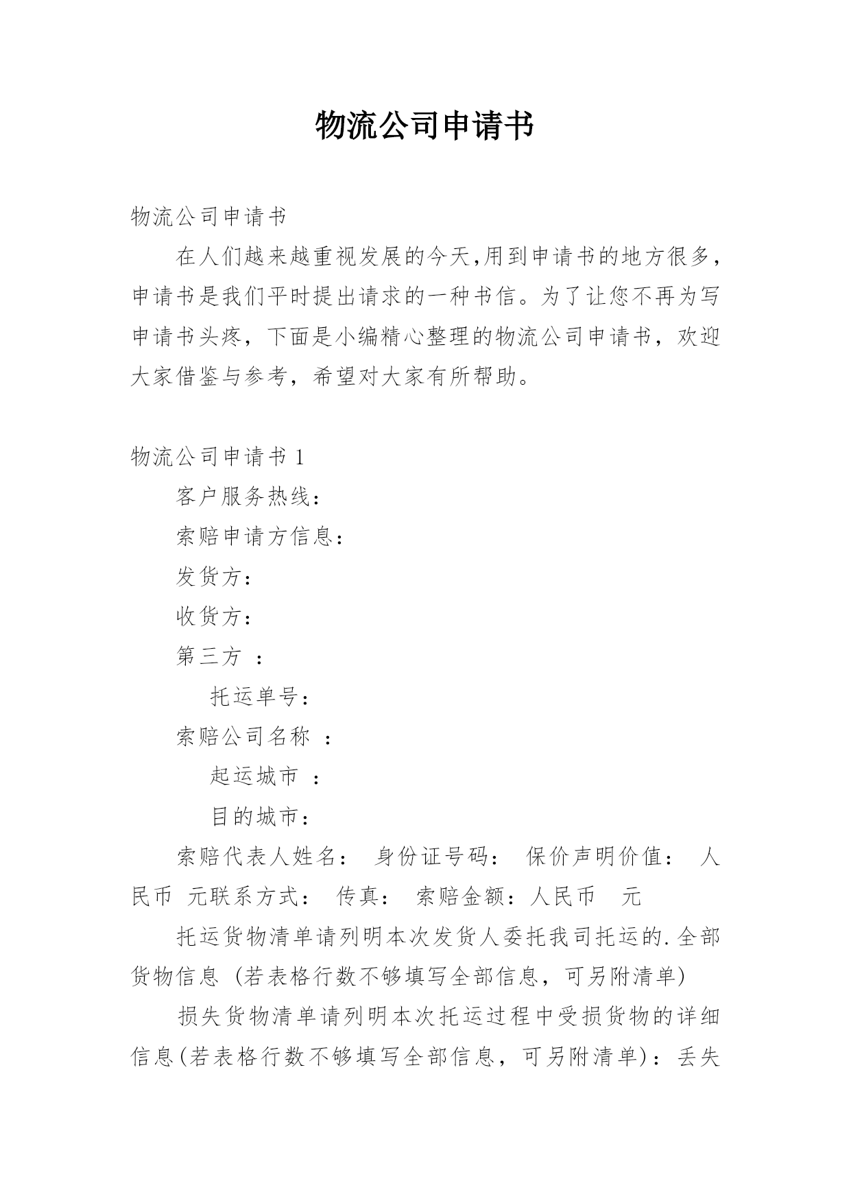 物流公司申请书物流公司申请书在人们越来越重视发展的今天,用到申请书的地方很多,申请书是我们平时提出请求的一种书信。为了让您不再为写申请书头疼,下面是小编精心整理的物流公司申请书,欢迎大家借鉴与参考,希望对大家有所帮助。物流公司申请书1客户服务热线:索赔申请方信息:发货方:收货方:第三方:托运单号:索赔公司名称:起运城市:目的城市:索赔代表人姓名:身份证号码:保价声明价值:人民币元联系方式:传真:索赔金额:人民币元托运货物清单请列明本次发货人委托我司托运的.全部货物信息(若表格行数不够填写全部信息,可另附清