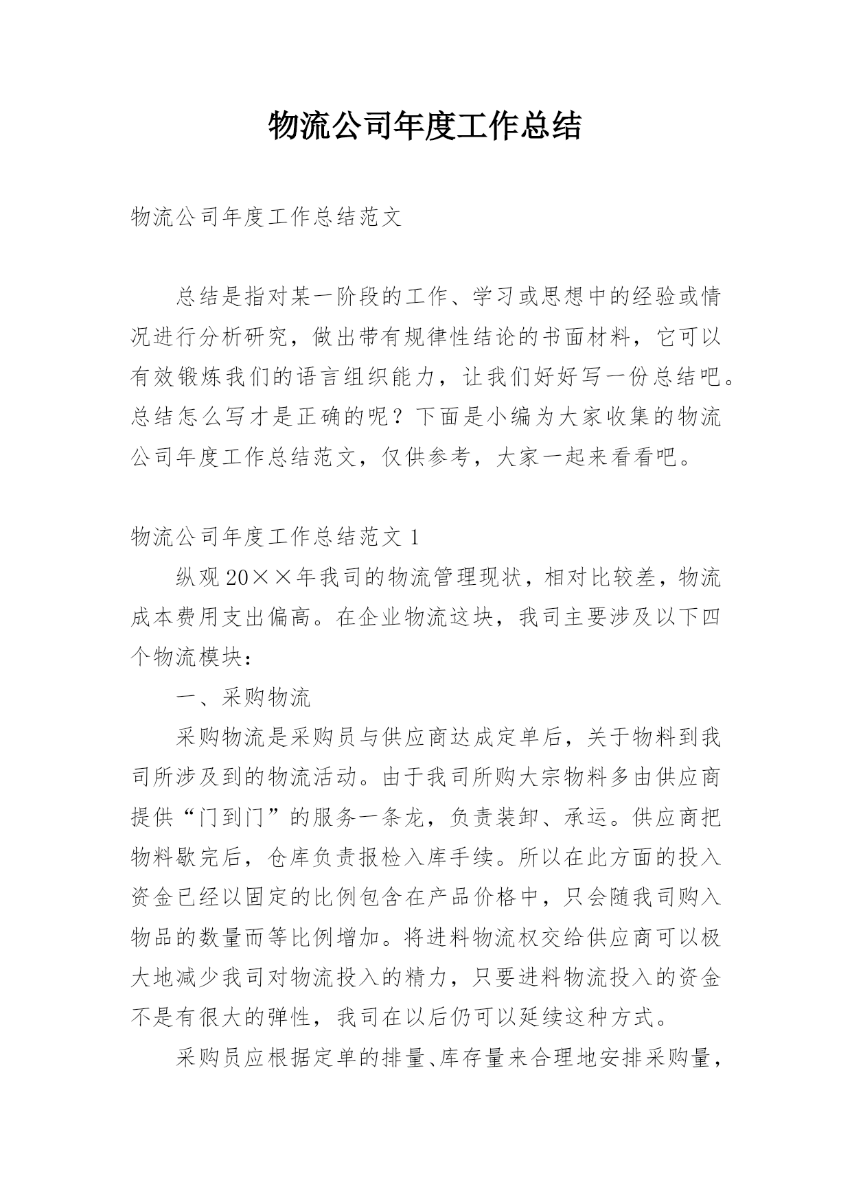 物流公司年度工作总结物流公司年度工作总结范文总结是指对某一阶段的工作、学习或思想中的经验或情况进行分析研究,做出带有规律性结论的书面材料,它可以有效锻炼我们的语言组织能力,让我们好好写一份总结吧。总结怎么写才是正确的呢?下面是小编为大家收集的物流公司年度工作总结范文,仅供参考,大家一起来看看吧。物流公司年度工作总结范文1纵观20××年我司的物流管理现状,相对比较差,物流成本费用支出偏高。在企业物流这块,我司主要涉及以下四个物流模块:一、采购物流采购物流是采购员与供应商达成定单后,关于物料到我司所涉及到的物