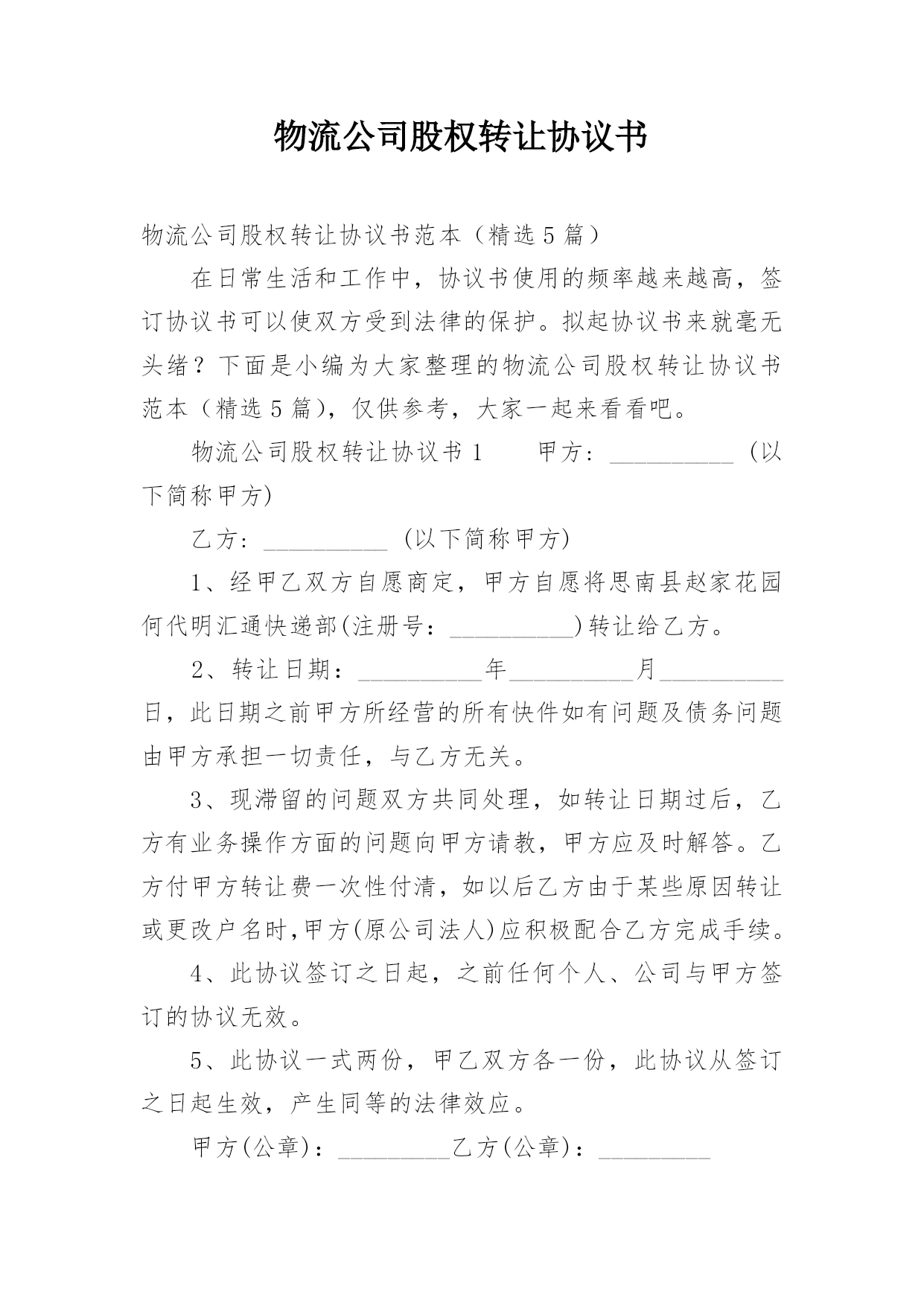 物流公司股权转让协议书物流公司股权转让协议书范本(精选5篇)在日常生活和工作中,协议书使用的频率越来越高,签订协议书可以使双方受到法律的保护。拟起协议书来就毫无头绪?下面是小编为大家整理的物流公司股权转让协议书范本(精选5篇),仅供参考,大家一起来看看吧。物流公司股权转让协议书1甲方:__________(以下简称甲方)乙方:__________(以下简称甲方)1、经甲乙双方自愿商定,甲方自愿将思南县赵家花园何代明汇通快递部(注册号:__________)转让给乙方。2、转让日期:__________年_
