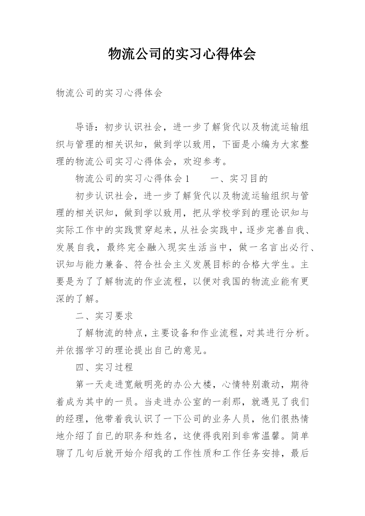物流公司的实习心得体会物流公司的实习心得体会导语:初步认识社会,进一步了解货代以及物流运输组织与管理的相关识知,做到学以致用,下面是小编为大家整理的物流公司实习心得体会,欢迎参考。物流公司的实习心得体会1一、实习目的初步认识社会,进一步了解货代以及物流运输组织与管理的相关识知,做到学以致用,把从学校学到的理论识知与实际工作中的实践贯穿起来,从社会实践中,逐步完善自我、发展自我,最终完全融入现实生活当中,做一名言出必行、识知与能力兼备、符合社会主义发展目标的合格大学生。主要是为了了解物流的作业流程,以便对我