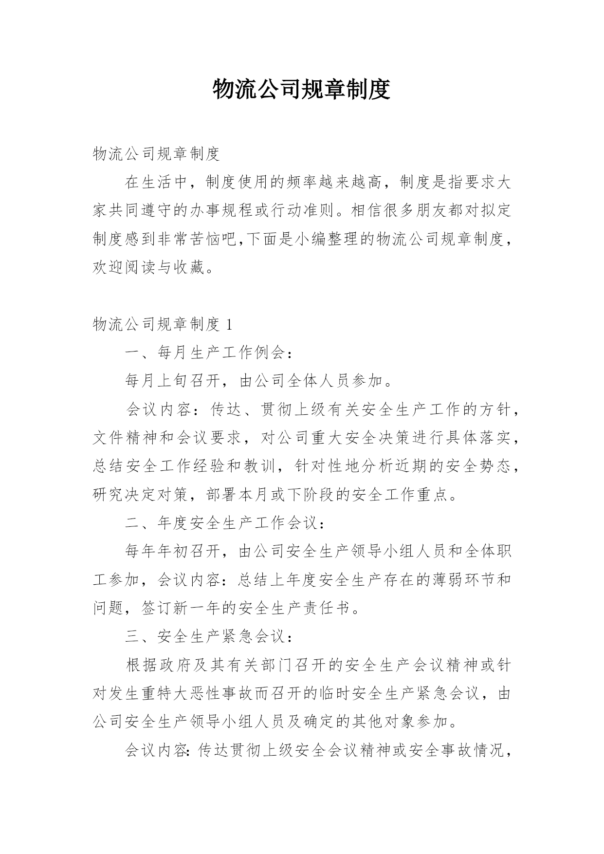 物流公司规章制度物流公司规章制度在生活中,制度使用的频率越来越高,制度是指要求大家共同遵守的办事规程或行动准则。相信很多朋友都对拟定制度感到非常苦恼吧,下面是小编整理的物流公司规章制度,欢迎阅读与收藏。物流公司规章制度1一、每月生产工作例会:每月上旬召开,由公司全体人员参加。会议内容:传达、贯彻上级有关安全生产工作的方针,文件精神和会议要求,对公司重大安全决策进行具体落实,总结安全工作经验和教训,针对性地分析近期的安全势态,研究决定对策,部署本月或下阶段的安全工作重点。二、年度安全生产工作会议:每年年初召