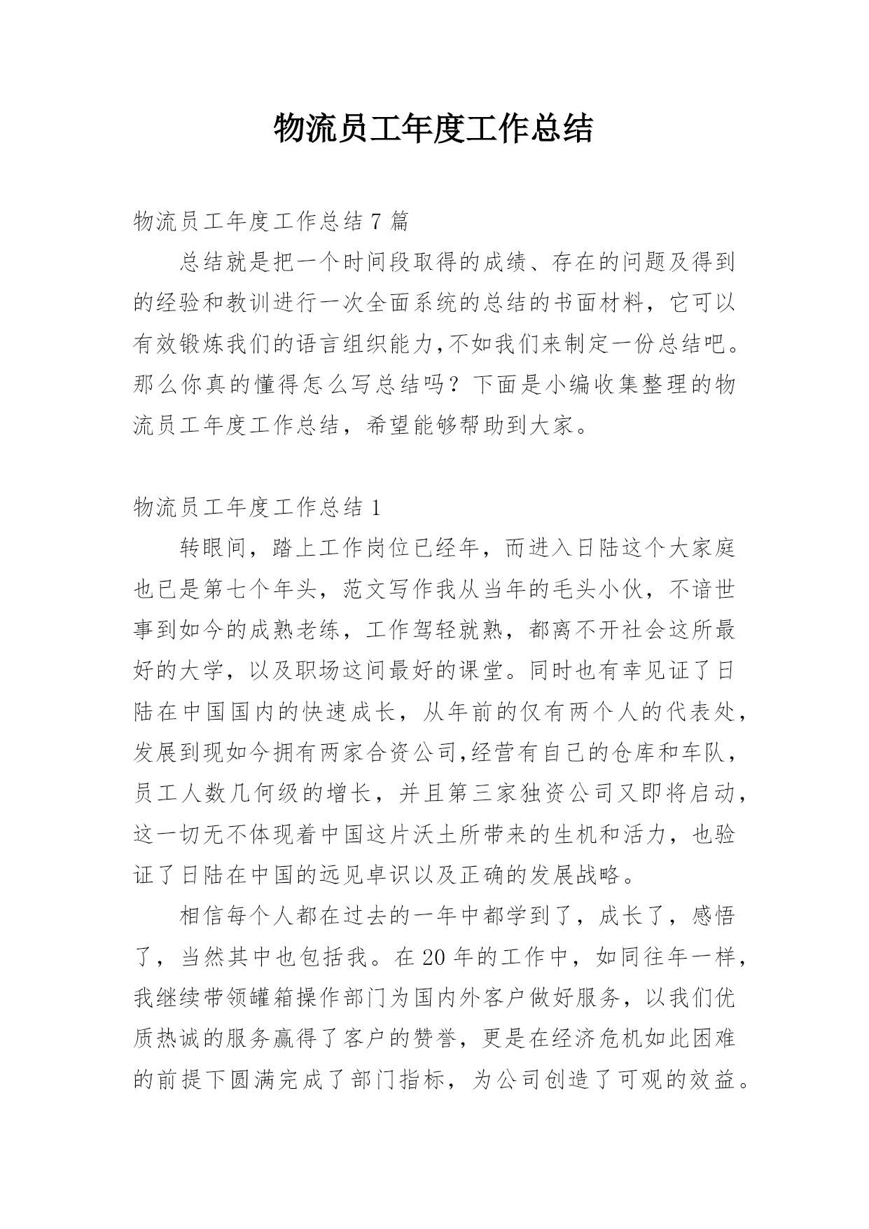 物流员工年度工作总结物流员工年度工作总结7篇总结就是把一个时间段取得的成绩、存在的问题及得到的经验和教训进行一次全面系统的总结的书面材料,它可以有效锻炼我们的语言组织能力,不如我们来制定一份总结吧。那么你真的懂得怎么写总结吗?下面是小编收集整理的物流员工年度工作总结,希望能够帮助到大家。物流员工年度工作总结1转眼间,踏上工作岗位已经年,而进入日陆这个大家庭也已是第七个年头,范文写作我从当年的毛头小伙,不谙世事到如今的成熟老练,工作驾轻就熟,都离不开社会这所最好的大学,以及职场这间最好的课堂。同时也有幸见证