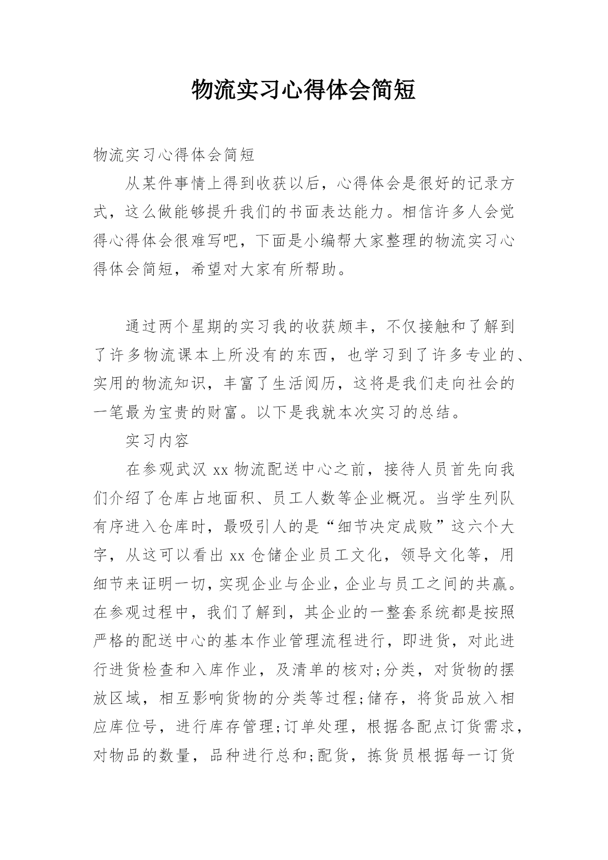 物流实习心得体会简短物流实习心得体会简短从某件事情上得到收获以后,心得体会是很好的记录方式,这么做能够提升我们的书面表达能力。相信许多人会觉得心得体会很难写吧,下面是小编帮大家整理的物流实习心得体会简短,希望对大家有所帮助。通过两个星期的实习我的收获颇丰,不仅接触和了解到了许多物流课本上所没有的东西,也学习到了许多专业的、实用的物流知识,丰富了生活阅历,这将是我们走向社会的一笔最为宝贵的财富。以下是我就本次实习的总结。实习内容在参观武汉xx物流配送中心之前,接待人员首先向我们介绍了仓库占地面积、员工人数等