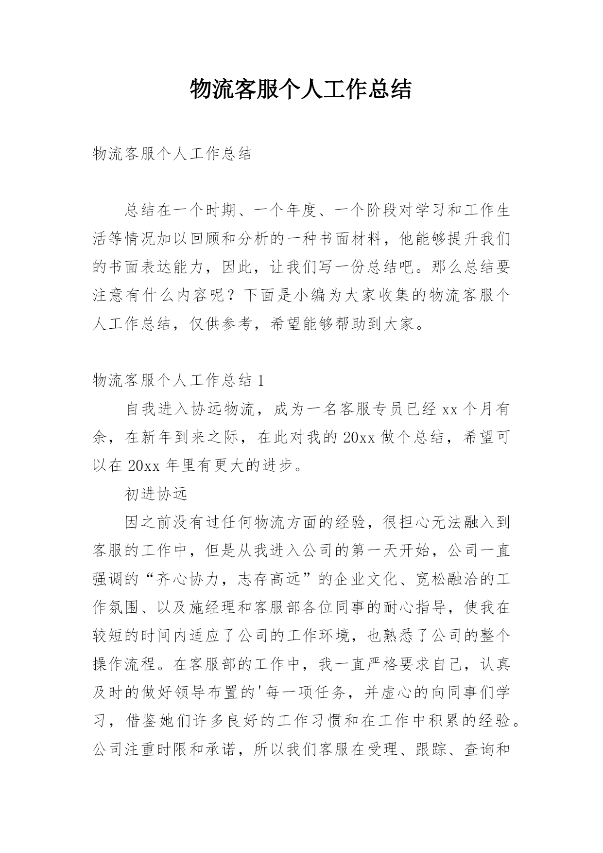 物流客服个人工作总结物流客服个人工作总结总结在一个时期、一个年度、一个阶段对学习和工作生活等情况加以回顾和分析的一种书面材料,他能够提升我们的书面表达能力,因此,让我们写一份总结吧。那么总结要注意有什么内容呢?下面是小编为大家收集的物流客服个人工作总结,仅供参考,希望能够帮助到大家。物流客服个人工作总结1自我进入协远物流,成为一名客服专员已经xx个月有余,在新年到来之际,在此对我的20xx做个总结,希望可以在20xx年里有更大的进步。初进协远因之前没有过任何物流方面的经验,很担心无法融入到客服的工作中,但