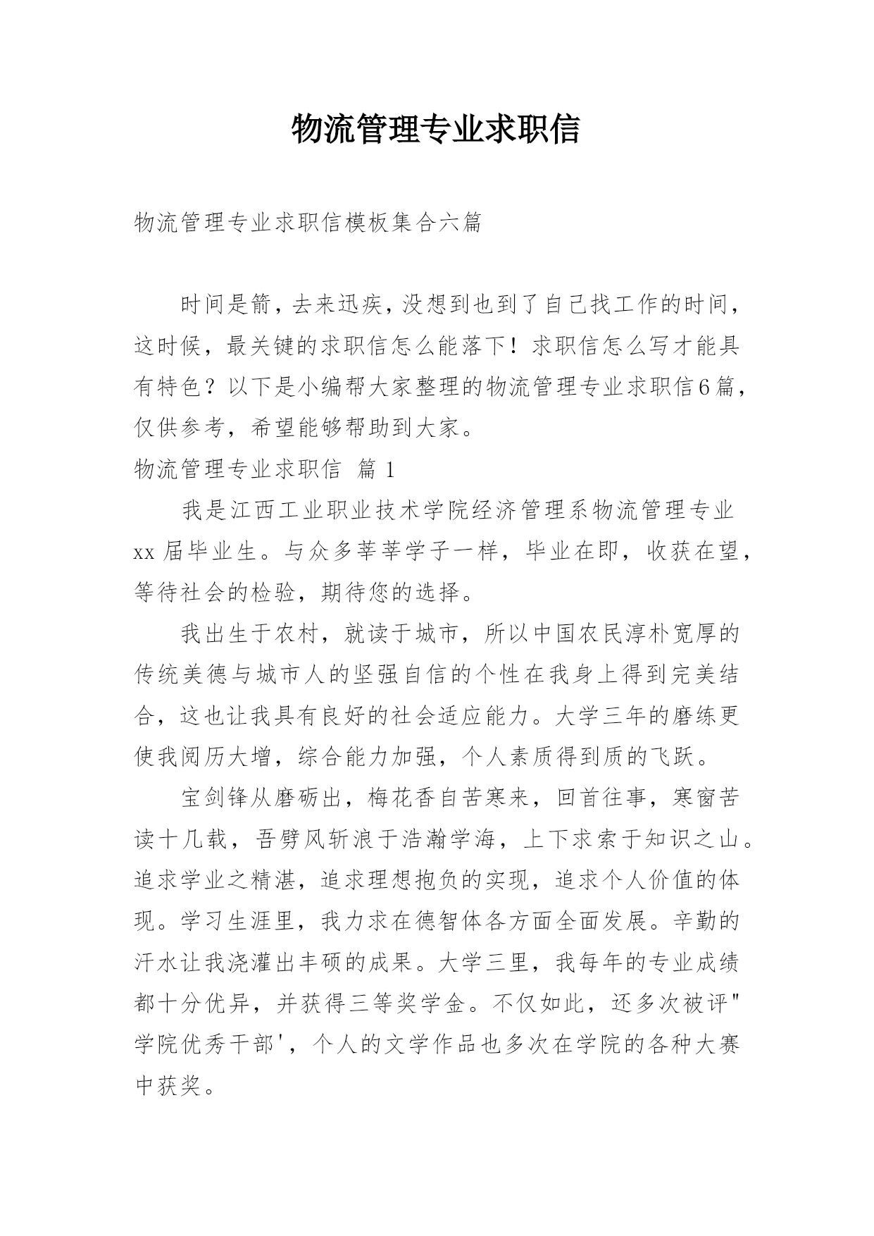 物流管理专业求职信物流管理专业求职信模板集合六篇时间是箭,去来迅疾,没想到也到了自己找工作的时间,这时候,最关键的求职信怎么能落下!求职信怎么写才能具有特色?以下是小编帮大家整理的物流管理专业求职信6篇,仅供参考,希望能够帮助到大家。物流管理专业求职信篇1我是江西工业职业技术学院经济管理系物流管理专业xx届毕业生。与众多莘莘学子一样,毕业在即,收获在望,等待社会的检验,期待您的选择。我出生于农村,就读于城市,所以中国农民淳朴宽厚的传统美德与城市人的坚强自信的个性在我身上得到完美结合,这也让我具有良好的社会