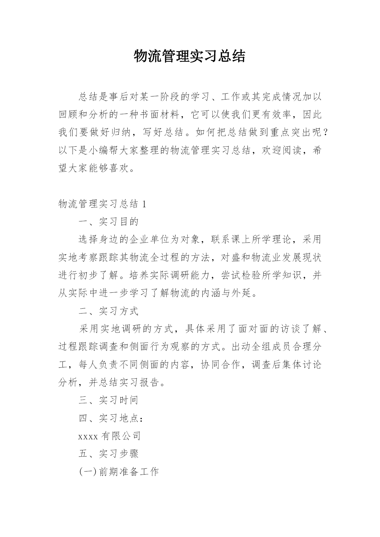 物流管理实习总结总结是事后对某一阶段的学习、工作或其完成情况加以回顾和分析的一种书面材料,它可以使我们更有效率,因此我们要做好归纳,写好总结。如何把总结做到重点突出呢?以下是小编帮大家整理的物流管理实习总结,欢迎阅读,希望大家能够喜欢。物流管理实习总结1一、实习目的选择身边的企业单位为对象,联系课上所学理论,采用实地考察跟踪其物流全过程的方法,对盛和物流业发展现状进行初步了解。培养实际调研能力,尝试检验所学知识,并从实际中进一步学习了解物流的内涵与外延。二、实习方式采用实地调研的方式,具体采用了面对面的访
