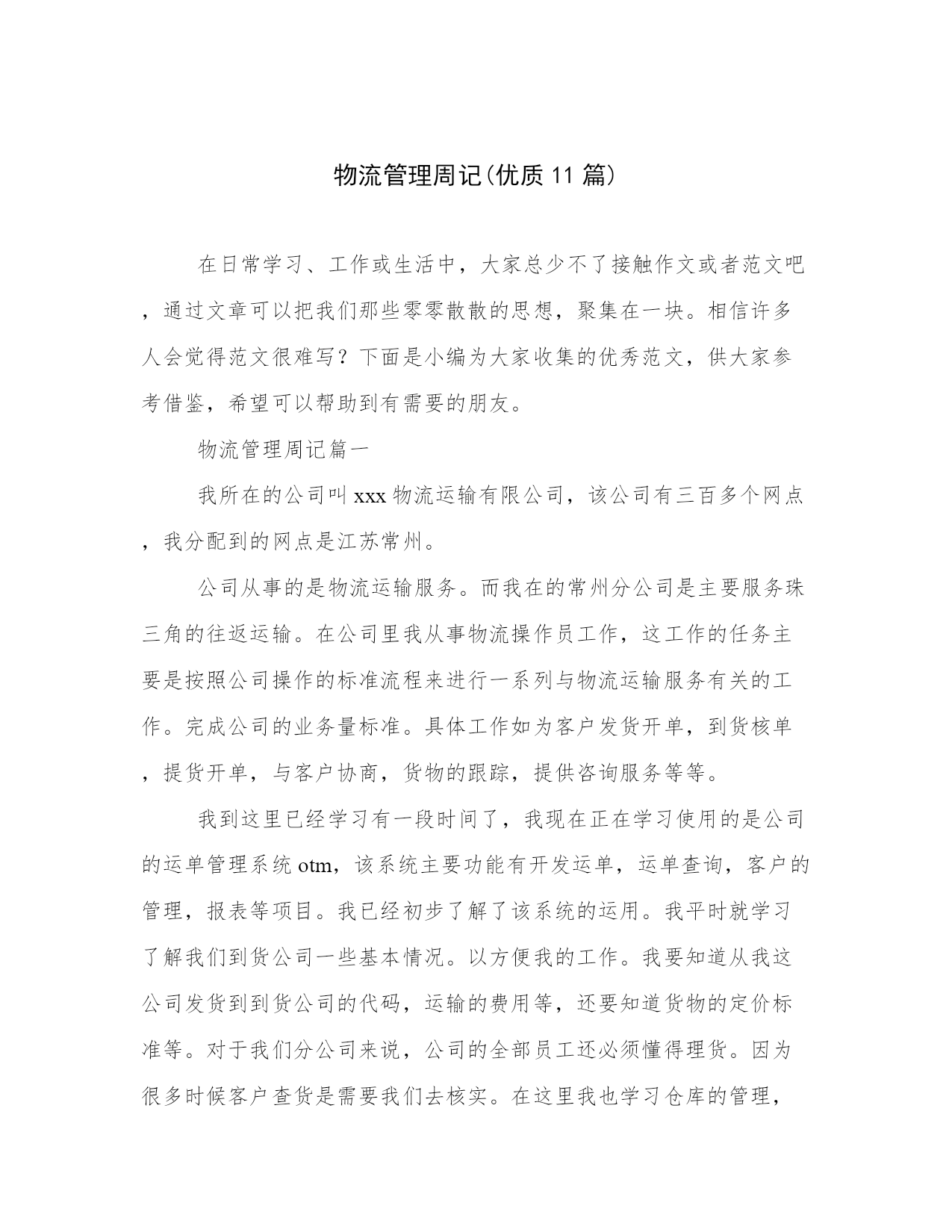 物流管理周记(优质11篇)在日常学习、工作或生活中,大家总少不了接触作文或者范文吧,通过文章可以把我们那些零零散散的思想,聚集在一块。相信许多人会觉得范文很难写?下面是小编为大家收集的优秀范文,供大家参考借鉴,希望可以帮助到有需要的朋友。物流管理周记篇一我所在的公司叫xxx物流运输有限公司,该公司有三百多个网点,我分配到的网点是江苏常州。公司从事的是物流运输服务。而我在的常州分公司是主要服务珠三角的往返运输。在公司里我从事物流操作员工作,这工作的任务主要是按照公司操作的标准流程来进行一系列与物流运输服务有
