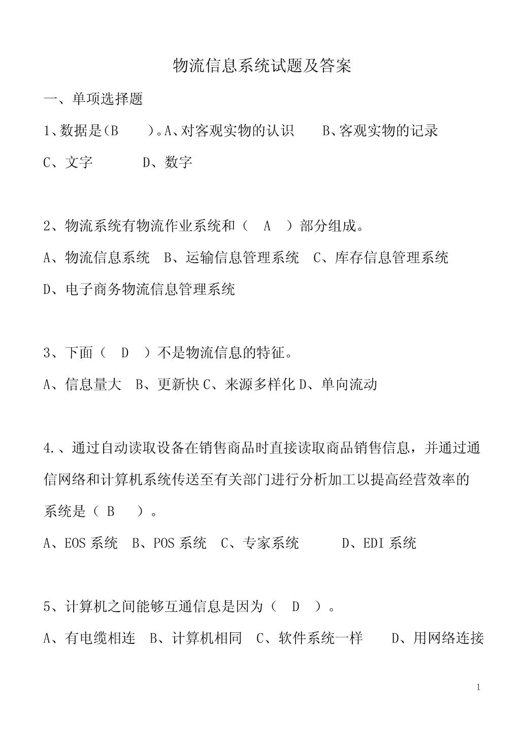 物流信息系统试题及答案一、单项选择题1、数据是(B)。A、对客观实物的认识B、客观实物的记录C、文字D、数字2、物流系统有物流作业系统和(A)部分组成。A、物流信息系统B、运输信息管理系统C、库存信息管理系统D、电子商务物流信息管理系统3、下面(D)不是物流信息的特征。A、信息量大B、更新快C、来源多样化D、单向流动4.、通过自动读取设备在销售商品时直接读取商品销售信息,并通过通信网络和计算机系统传送至有关部门进行分析加工以提高经营效率的系统是(B)。A、EOS系统B、POS系统C、专家系统D、EDI系统