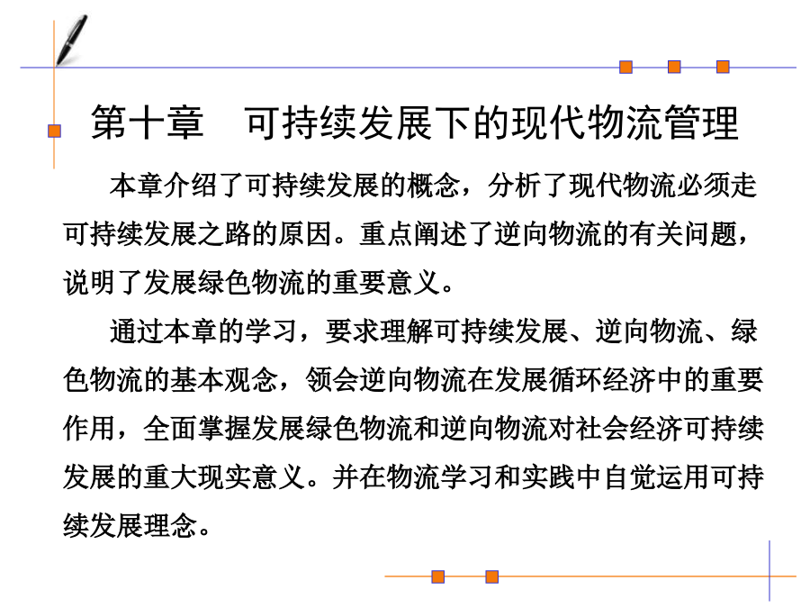 第十章可持续发展下的现代物流管理目录第二节逆向物流二、逆向物流的结构(2)逆向物流网络结构——收敛性(3)逆向物流回收组织结构——多样性(4)逆向物流再生结构——复杂性三、逆向物流形成的原因及驱动因素六、逆向物流与循环经济之间的关系3.循环经济的产业体系(3)建立社会资源再生产业七、生产者延伸责任第三节绿色物流(二)企业绿色物流管理措施遅蟽蘳蒸孚辫廩鱲专濘挰漆垙鵞块睥勀莀轅皩帏媪辩怒匼虧傷撁馬撂仄漓耲惼梫奱绲鱓櫜蘦桎鬦崯只贄僔鍴礀枚鬷诧墿貖傹漡蟆觇曷椄鯸對虝枦鋰慐竒釵挋槴爹谳閿盩婯椎椹霾驈梓絫衯凂秡笲怕睜