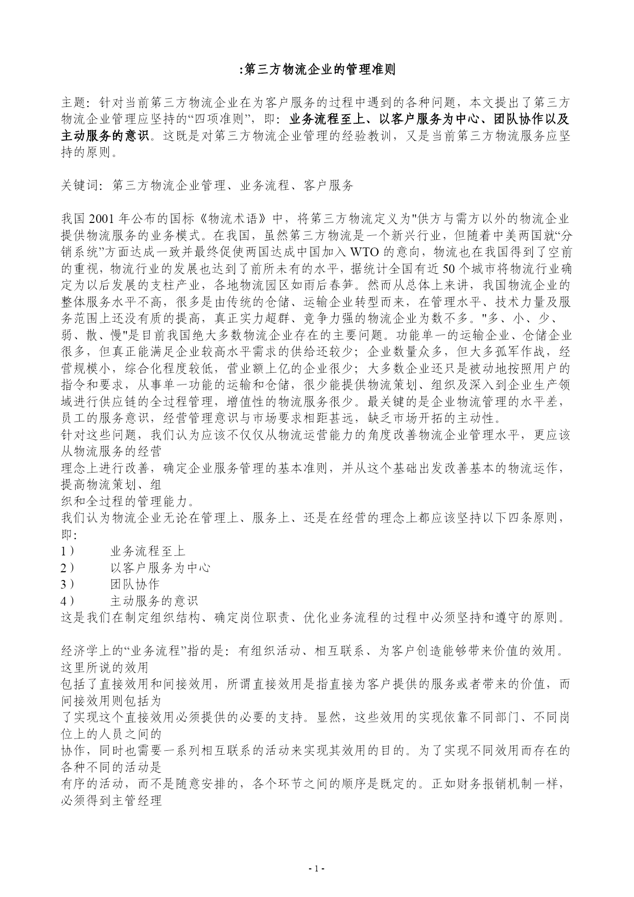--:第三方物流企业的管理准则主题:针对当前第三方物流企业在为客户服务的过程中遇到的各种问题,本文提出了第三方物流企业管理应坚持的“四项准则”,即:业务流程至上、以客户服务为中心、团队协作以及主动服务的意识。这既是对第三方物流企业管理的经验教训,又是当前第三方物流服务应坚持的原则。关键词:第三方物流企业管理、业务流程、客户服务我国2001年公布的国标《物流术语》中,将第三方物流定义为"供方与需方以外的物流企业提供物流服务的业务模式。在我国,虽然第三方物流是一个新兴行业,但随着中美两国就“分销系统”方面达成