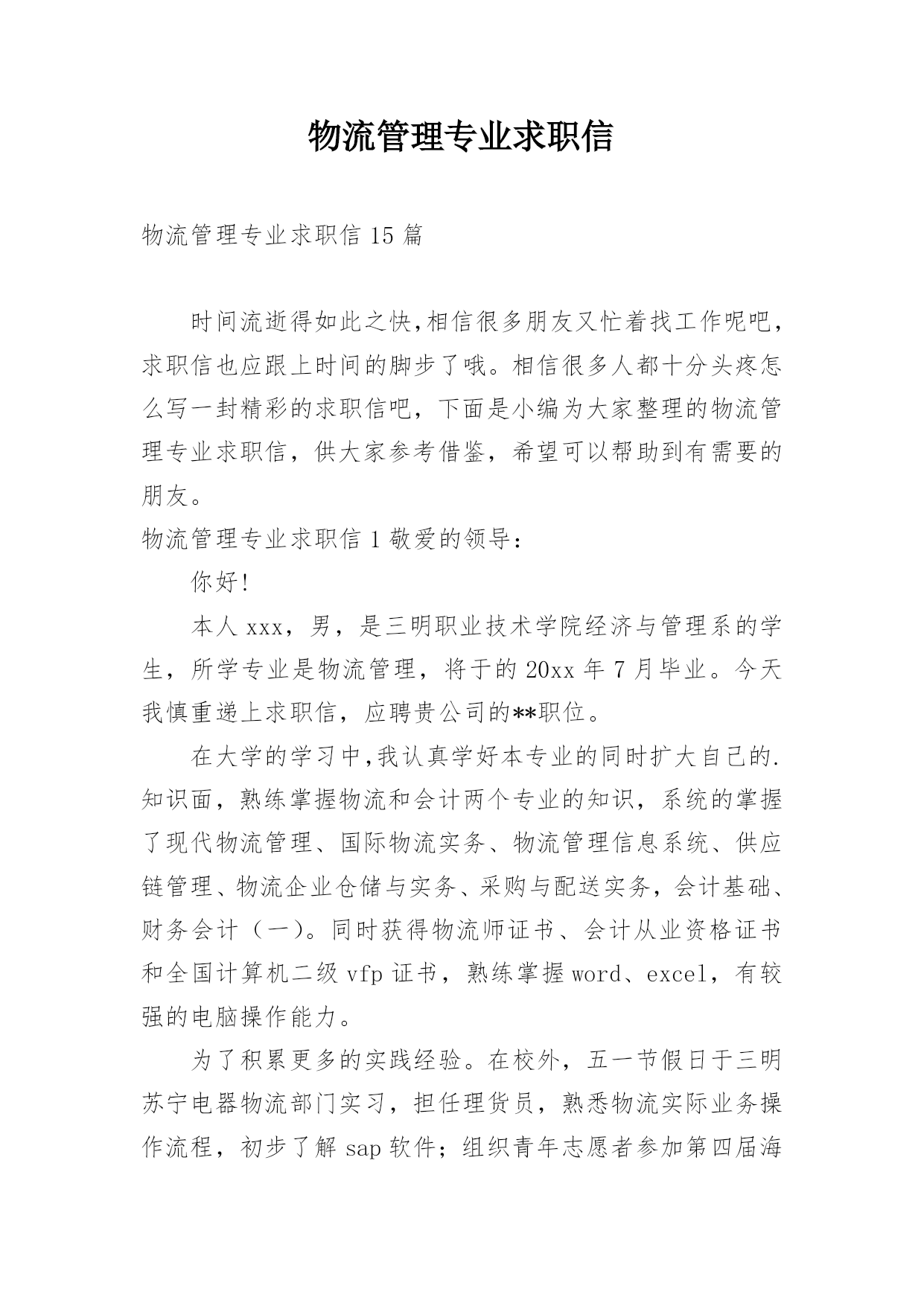 物流管理专业求职信物流管理专业求职信15篇时间流逝得如此之快,相信很多朋友又忙着找工作呢吧,求职信也应跟上时间的脚步了哦。相信很多人都十分头疼怎么写一封精彩的求职信吧,下面是小编为大家整理的物流管理专业求职信,供大家参考借鉴,希望可以帮助到有需要的朋友。物流管理专业求职信1敬爱的领导:你好!本人xxx,男,是三明职业技术学院经济与管理系的学生,所学专业是物流管理,将于的20xx年7月毕业。今天我慎重递上求职信,应聘贵公司的**职位。在大学的学习中,我认真学好本专业的同时扩大自己的.知识面,熟练掌握物流和会