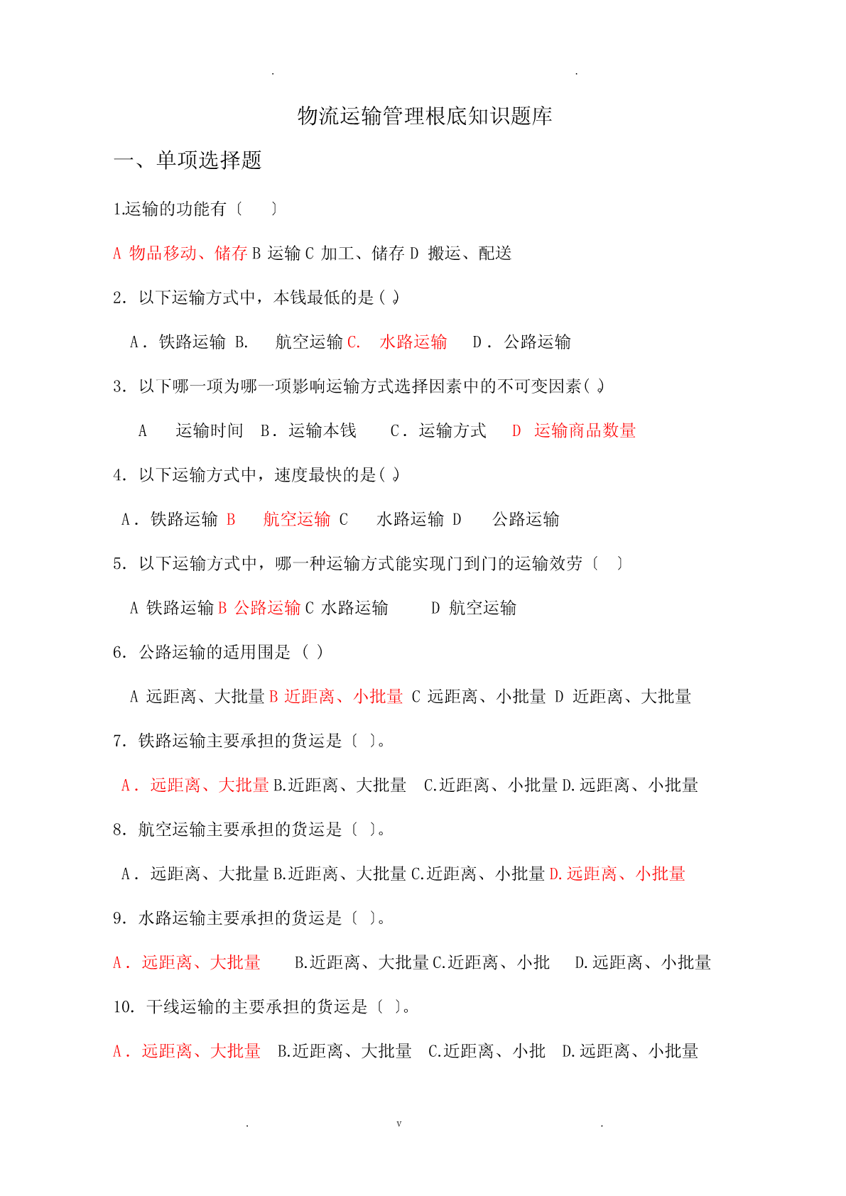 ..物流运输管理根底知识题库一、单项选择题1.运输的功能有〔〕A物品移动、储存B运输C加工、储存D搬运、配送2.以下运输方式中,本钱最低的是(。)A.铁路运输B.航空运输C.水路运输D.公路运输3.以下哪一项为哪一项影响运输方式选择因素中的不可变因素(。)A运输时间B.运输本钱C.运输方式D运输商品数量4.以下运输方式中,速度最快的是(。)A.铁路运输B航空运输C水路运输D公路运输5.以下运输方式中,哪一种运输方式能实现门到门的运输效劳〔〕A铁路运输B公路运输C水路运输D航空运输6.公路运输的适用围是()