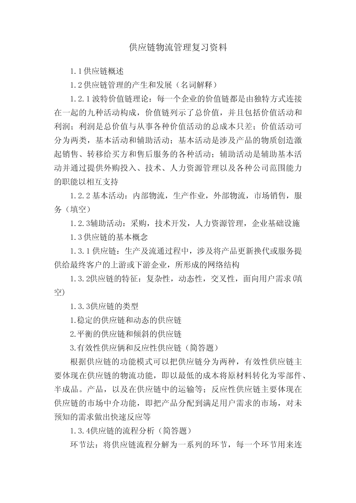 供应链物流管理复习资料1.1供应链概述1.2供应链管理的产生和发展(名词解释)1.2.1波特价值链理论:每一个企业的价值链都是由独特方式连接在一起的九种活动构成,价值链列示了总价值,并且包括价值活动和利润;利润是总价值与从事各种价值活动的总成本只差;价值活动可分为两类,基本活动和辅助活动;基本活动是涉及产品的物质创造激起销售、转移给买方和售后服务的各种活动;辅助活动是辅助基本活动并通过提供外购投入、技术、人力资源管理以及各种公司范围能力的职能以相互支持1.2.2基本活动:内部物流,生产作业,外部物流,市场