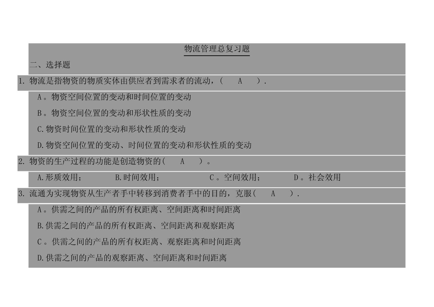 物流管理总复习题二、选择题1.物流是指物资的物质实体由供应者到需求者的流动,(A).A。物资空间位置的变动和时间位置的变动B。物资空间位置的变动和形状性质的变动C.物资时间位置的变动和形状性质的变动D.物资空间位置的变动、时间位置的变动和形状性质的变动2.物资的生产过程的功能是创造物资的(A)。A.形质效用;B.时间效用;C。空间效用;D。社会效用3.流通为实现物资从生产者手中转移到消费者手中的目的,克服(A).A。供需之间的产品的所有权距离、空间距离和时间距离B.供需之间的产品的所有权距离、空间距离和观