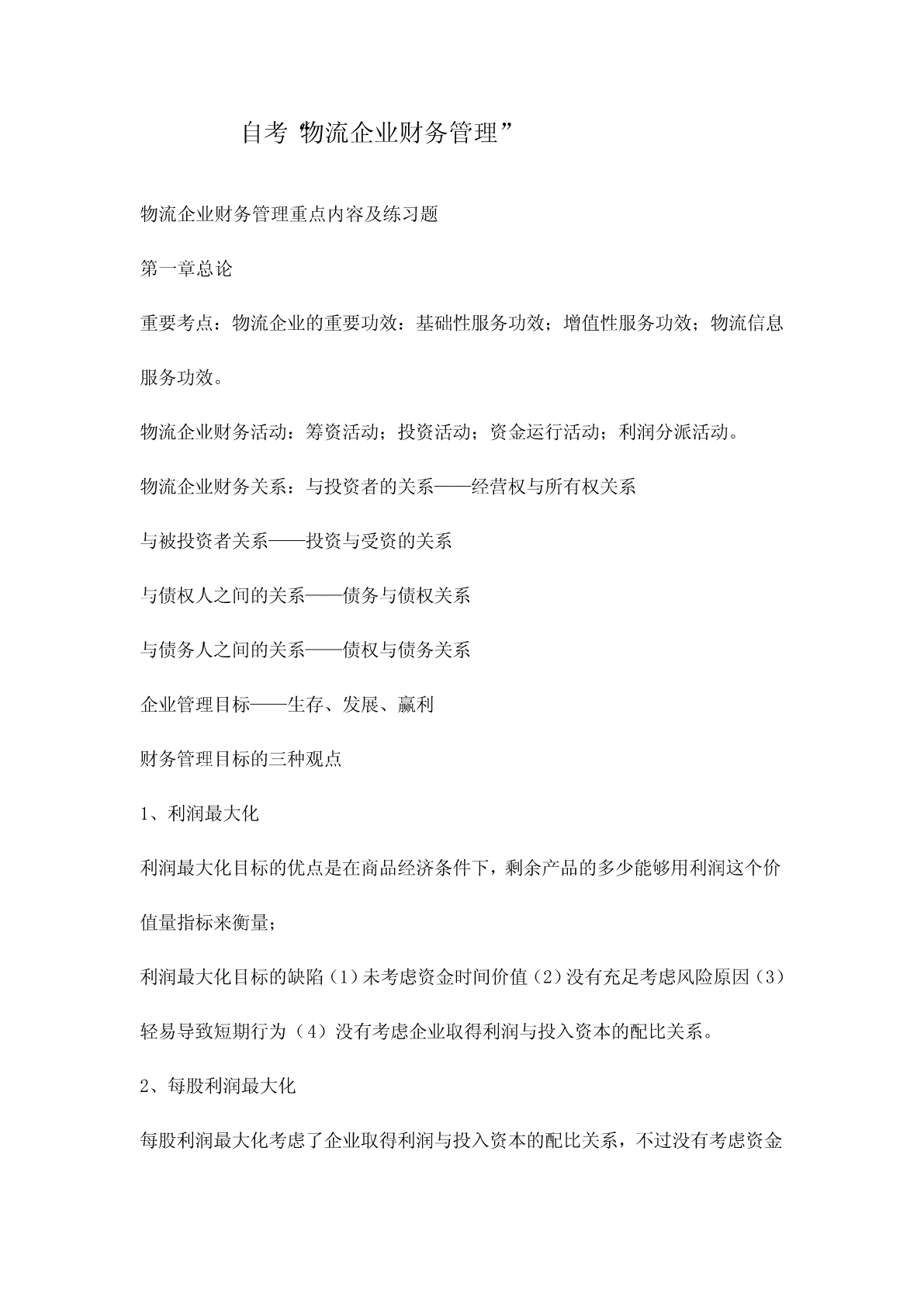 自考“物流企业财务管理”物流企业财务管理重点内容及练习题第一章总论重要考点:物流企业的重要功效:基础性服务功效;增值性服务功效;物流信息服务功效。物流企业财务活动:筹资活动;投资活动;资金运行活动;利润分派活动。物流企业财务关系:与投资者的关系——经营权与所有权关系与被投资者关系——投资与受资的关系与债权人之间的关系——债务与债权关系与债务人之间的关系——债权与债务关系企业管理目标——生存、发展、赢利财务管理目标的三种观点1、利润最大化利润最大化目标的优点是在商品经济条件下,剩余产品的多少能够用利润这个价