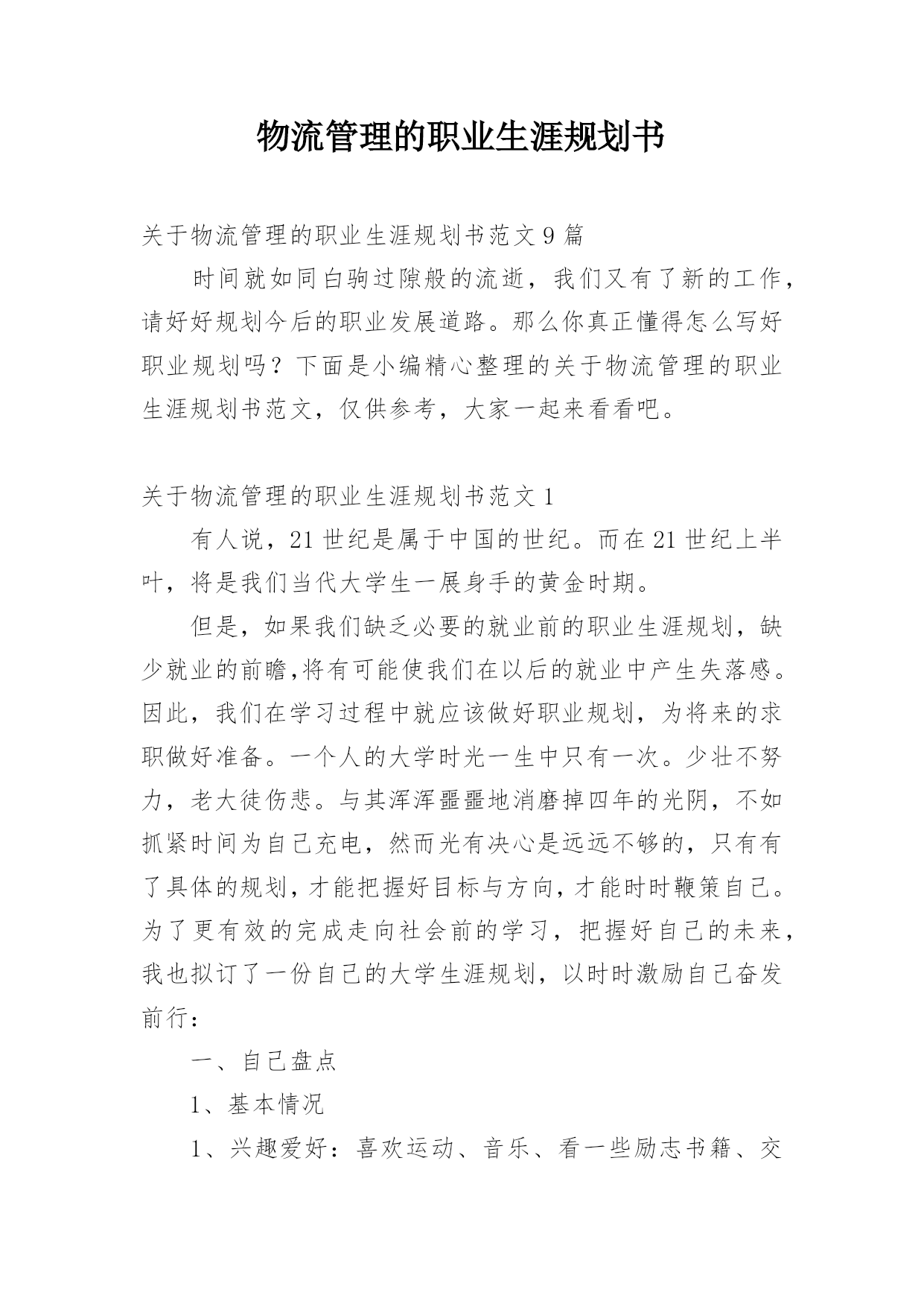 物流管理的职业生涯规划书关于物流管理的职业生涯规划书范文9篇时间就如同白驹过隙般的流逝,我们又有了新的工作,请好好规划今后的职业发展道路。那么你真正懂得怎么写好职业规划吗?下面是小编精心整理的关于物流管理的职业生涯规划书范文,仅供参考,大家一起来看看吧。关于物流管理的职业生涯规划书范文1有人说,21世纪是属于中国的世纪。而在21世纪上半叶,将是我们当代大学生一展身手的黄金时期。但是,如果我们缺乏必要的就业前的职业生涯规划,缺少就业的前瞻,将有可能使我们在以后的就业中产生失落感。因此,我们在学习过程中就应该