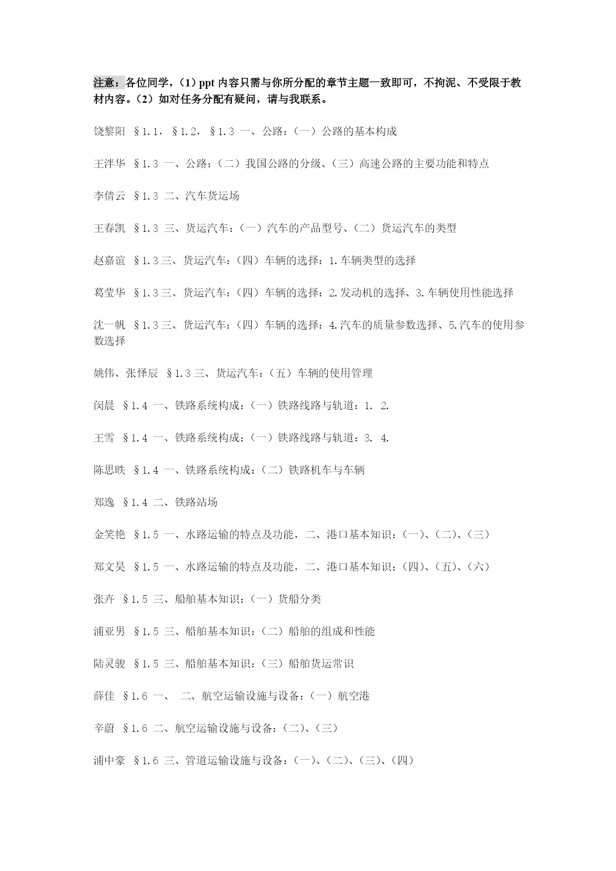 注意:各位同学,(1)ppt内容只需与你所分配的章节主题一致即可,不拘泥、不受限于教材内容。(2)如对任务分配有疑问,请与我联系。饶黎阳§1.1,§1.2,§1.3一、公路:(一)公路的基本构成王泮华§1.3一、公路:(二)我国公路的分级、(三)高速公路的主要功能和特点李倩云§1.3二、汽车货运场王春凯§1.3三、货运汽车:(一)汽车的产品型号、(二)货运汽车的类型赵嘉谊§1.3三、货运汽车:(四)车辆的选择:1.车辆类型的选择葛莹华§1.3三、货运汽车:(四)车辆的选择:2.发动机的选择、3.车辆使用性