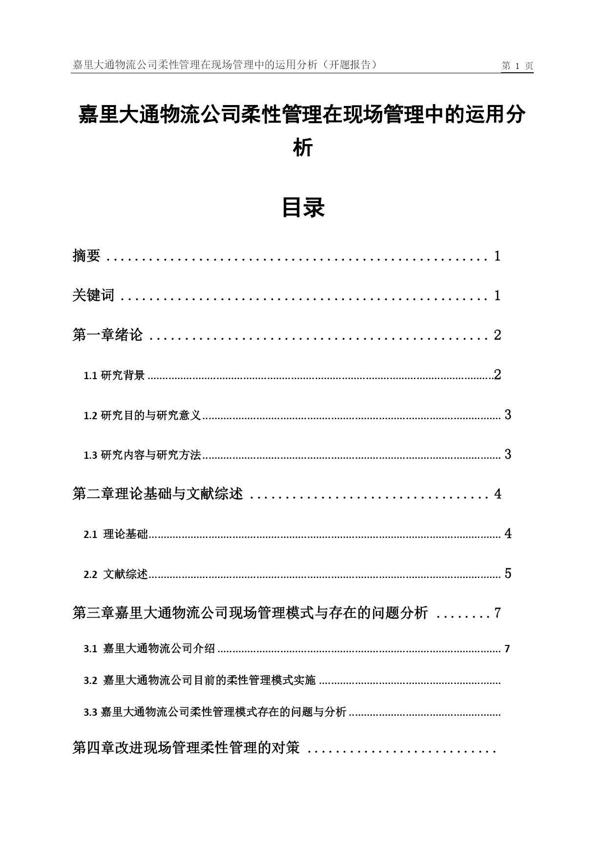 PAGE第PAGE21页嘉里大通物流公司柔性管理在现场管理中的运用分析(开题报告)嘉里大通物流公司柔性管理在现场管理中的运用分析目录HYPERLINK"D:\\用户目录\\我的文档\\tencentfiles\\1172031990\\filerecv\\新时期密切官兵关系的几点对策.docx"\l"_Toc17455"摘要1关键词1第一章绪论21.1研究背景HYPERLINK"file:///D:\\用户目录\\我的文档\\tencent%20files\\1172031990\\f