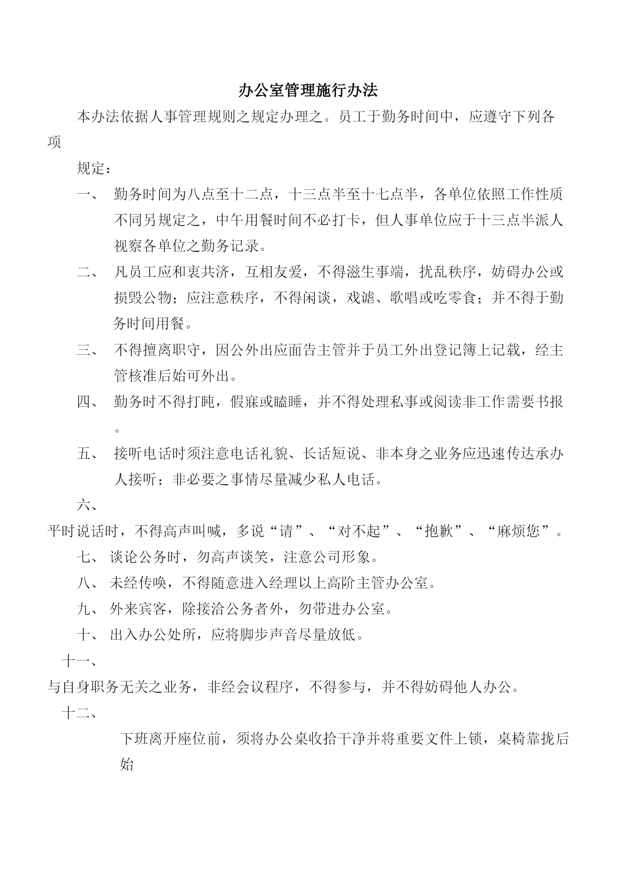 办公室管理施行办法本办法依据人事管理规则之规定办理之。员工于勤务时间中,应遵守下列各项规定:勤务时间为八点至十二点,十三点半至十七点半,各单位依照工作性质不同另规定之,中午用餐时间不必打卡,但人事单位应于十三点半派人视察各单位之勤务记录。凡员工应和衷共济,互相友爱,不得滋生事端,扰乱秩序,妨碍办公或损毁公物;应注意秩序,不得闲谈,戏谑、歌唱或吃零食;并不得于勤务时间用餐。不得擅离职守,因公外出应面告主管并于员工外出登记簿上记载,经主管核准后始可外出。勤务时不得打盹,假寐或瞌睡,并不得处理私事或阅读非工作需