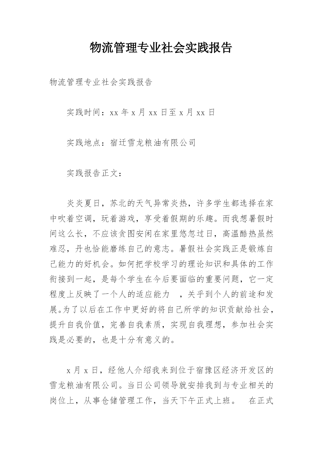 物流管理专业社会实践报告物流管理专业社会实践报告实践时间:xx年x月xx日至x月xx日实践地点:宿迁雪龙粮油有限公司实践报告正文:炎炎夏日,苏北的天气异常炎热,许多学生都选择在家中吹着空调,玩着游戏,享受着假期的乐趣。而我想暑假时间这么长,不应该贪图安闲在家里悠忽过日,高温酷热虽然难忍,丹也恰能磨练自己的意志。暑假社会实践正是锻炼自己能力的好机会。如何把学校学习的理论知识和具体的工作衔接到一起,是每个学生在今后要面临的重要问题,它一定程度上反映了一个人的适应能力,关乎到个人的前途和发展。为了以后在工作中更
