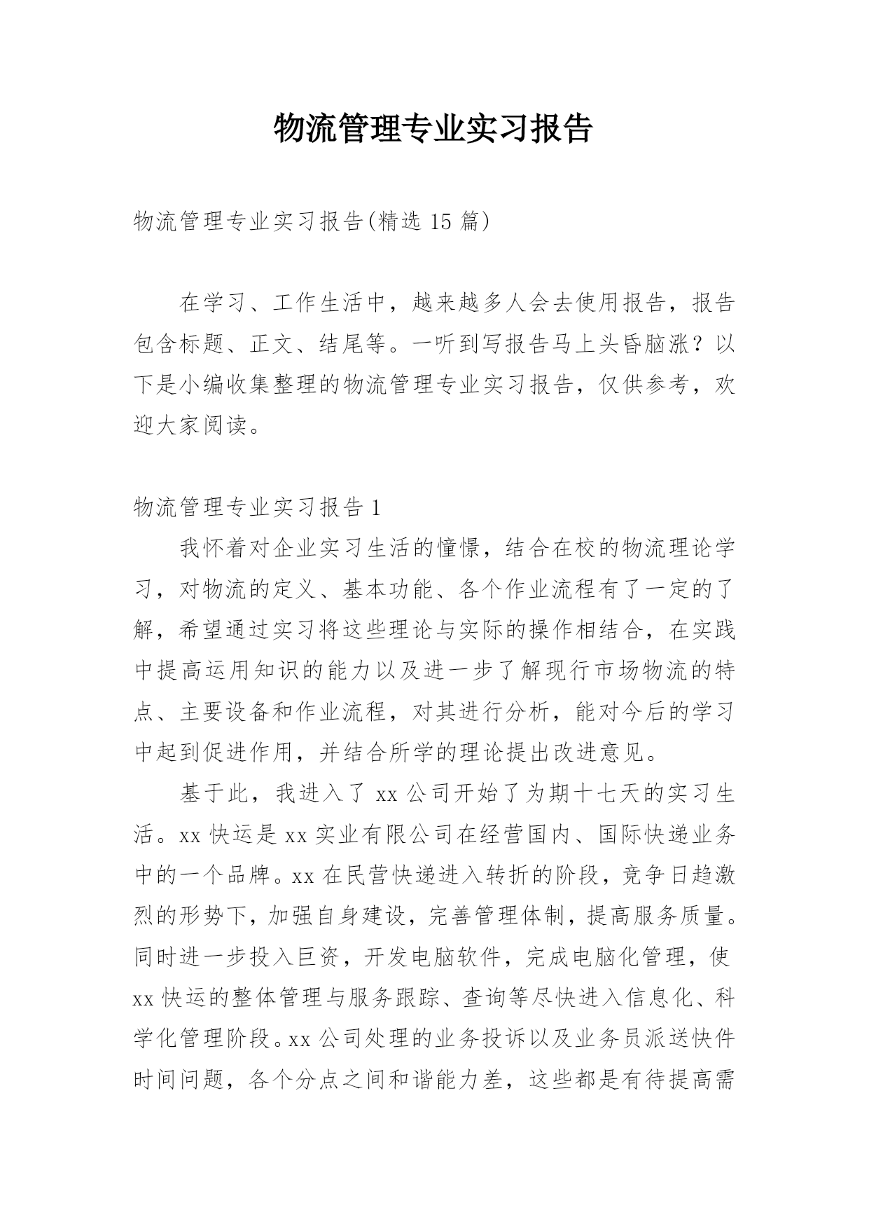 物流管理专业实习报告物流管理专业实习报告(精选15篇)在学习、工作生活中,越来越多人会去使用报告,报告包含标题、正文、结尾等。一听到写报告马上头昏脑涨?以下是小编收集整理的物流管理专业实习报告,仅供参考,欢迎大家阅读。物流管理专业实习报告1我怀着对企业实习生活的憧憬,结合在校的物流理论学习,对物流的定义、基本功能、各个作业流程有了一定的了解,希望通过实习将这些理论与实际的操作相结合,在实践中提高运用知识的能力以及进一步了解现行市场物流的特点、主要设备和作业流程,对其进行分析,能对今后的学习中起到促进作用,